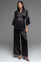 Брюки палаццо в комплекте обеспечивают безупречный силуэт, скрывая возможные несовершенства фигуры. Жакет с декоративными оборками по низу рукавов и подолу придает образу женственность и романтичность.