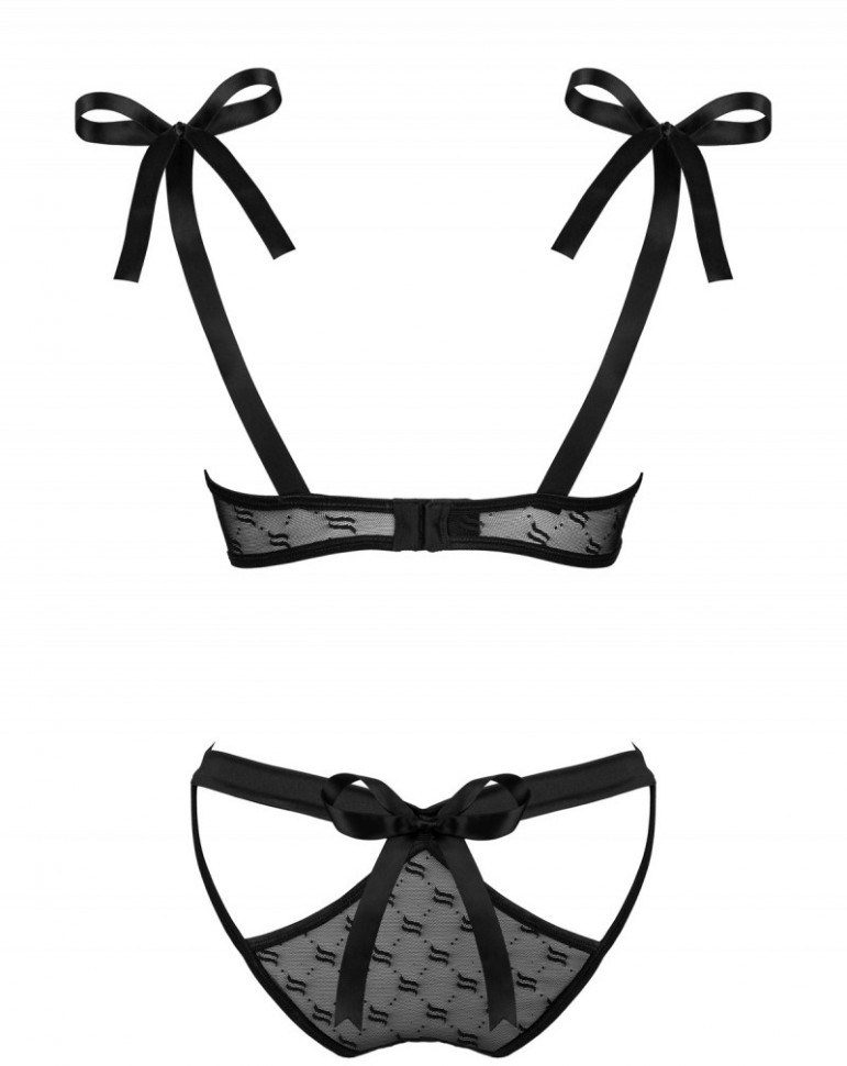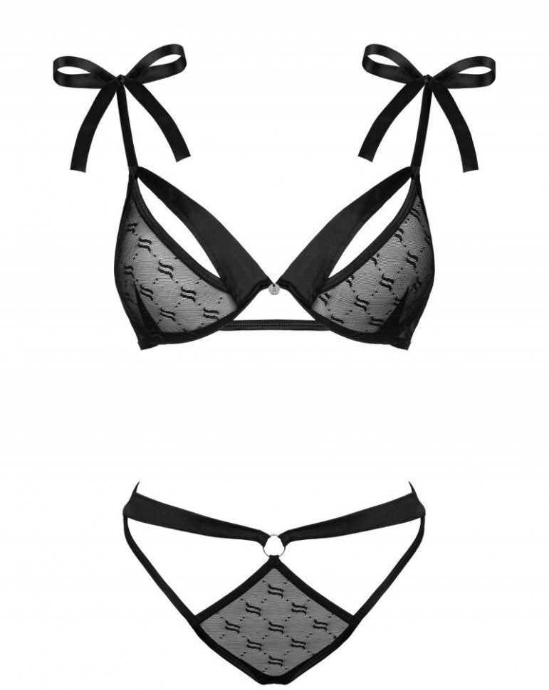 Роскошный комплект из коллекции Obsessivia сложного кроя выполнен из вуали с рисунком логотипа Obsessive: Мягкий бюстгальтер на косточках, бретельки из широких атласных лент завязываются на плечах, на спине застежка на удлинитель; Трусики панти с вырезами, с бантом из атласных лент над ягодицами.