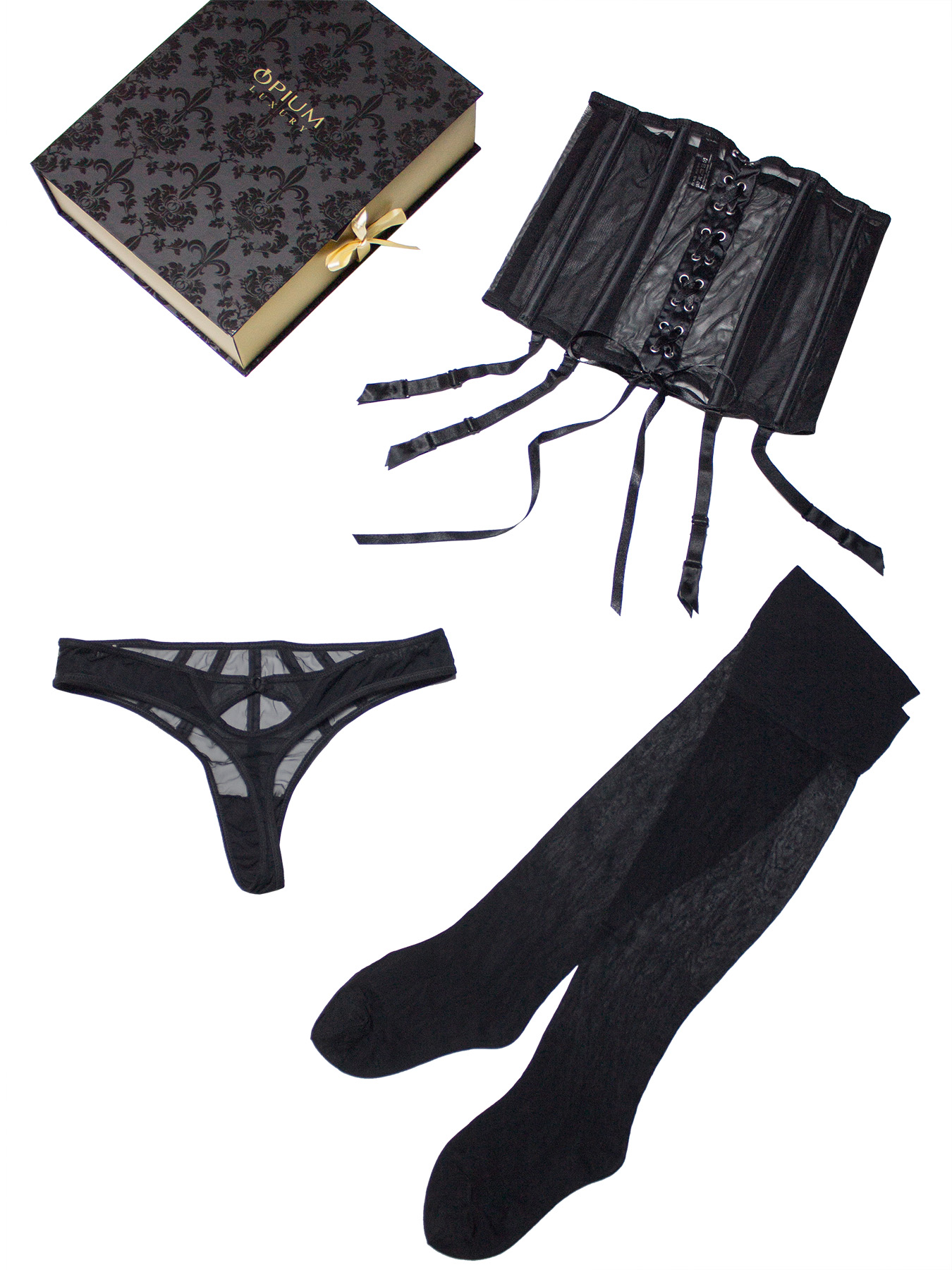 Подарочный набор для девушки, состоящий из шикарной коробки-шкатулки и комплекта нижнего белья для роковой соблазнительницы: пояс-корсет на косточках, со шнуровкой, трусики-стринг и чулки под пояс, все в черном цвете. Такой подарок никого не оставит равнодушным!