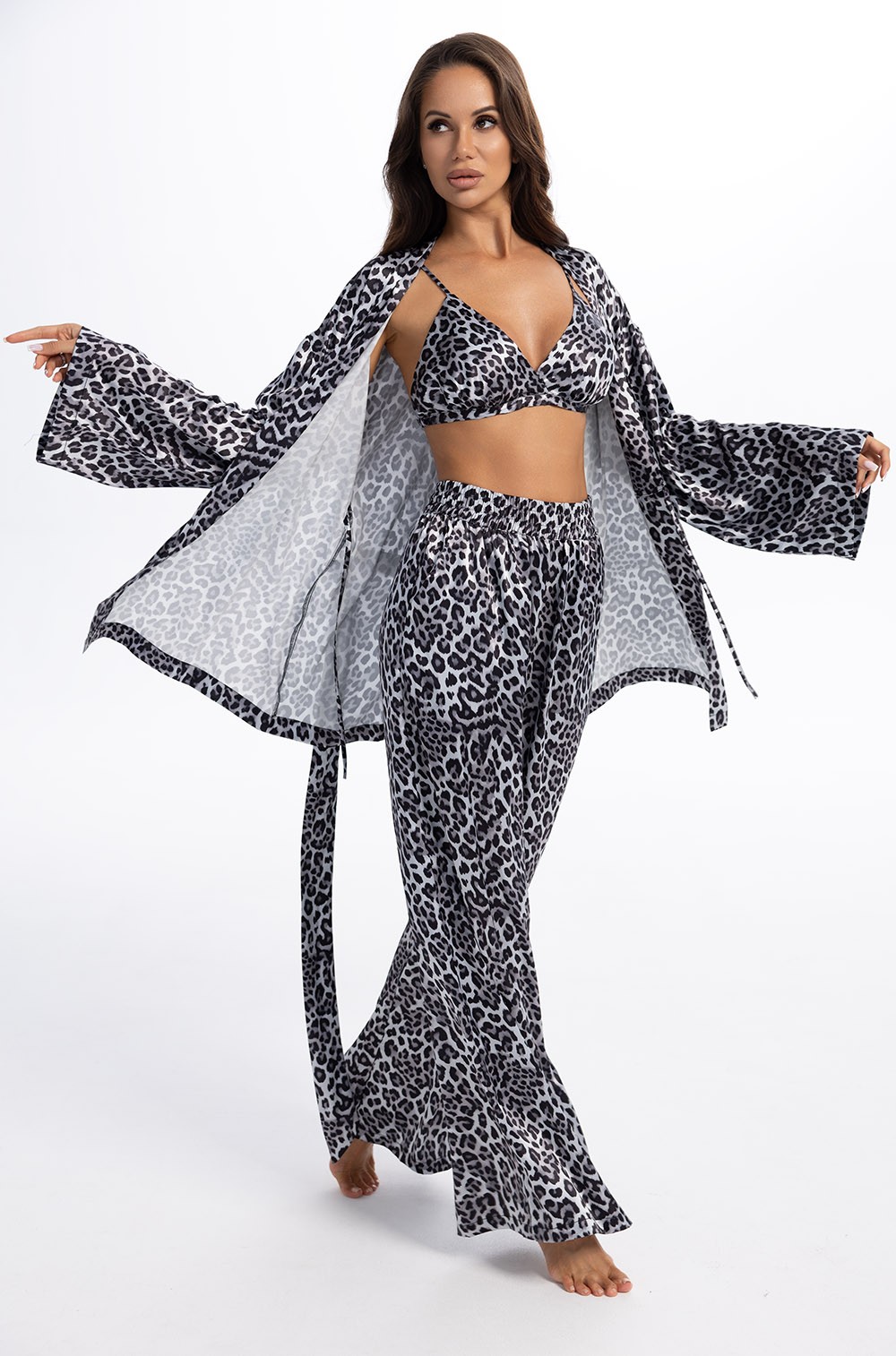 Откройте для себя гармонию комфорта и выразительного стиля с комплектом Maggie от Mia‑Amore. Тройка — жакет, брюки‑палаццо и топ — сочетает роскошь смесового шёлка, дерзкий анималистичный принт и продуманную функциональность. Это выбор для тех, кто ценит многогранность образа: от уютных домашних моментов до эффектных выходов.