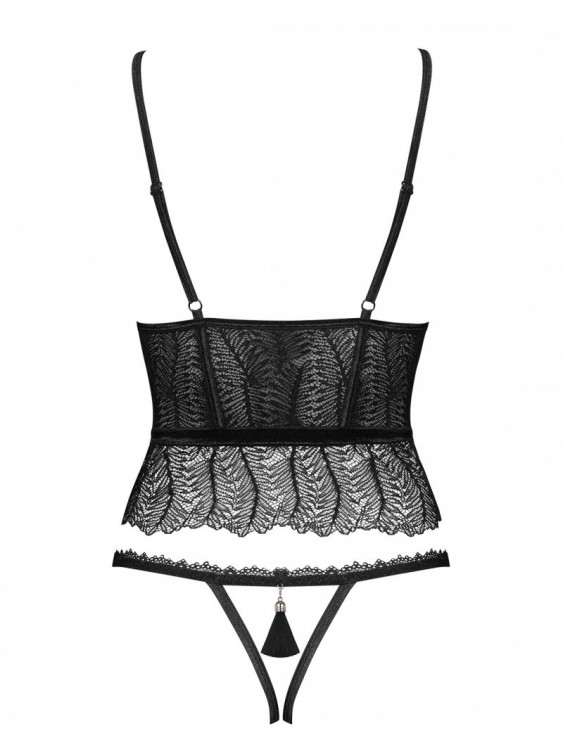 Сексуальный короткий женский корсет ROMANESA от европейского производителя Obsessive. Нежное кружево в лиственный принт. Регулируемые бретели и шнуровка спереди. Открытые чашки. В комплект входят трусики стринги с открытой зоной ластовицы и кисточкой сзади.В таком эффектном и ярком сексуальном белье с чулками вы сможете продемонстрировать свою сексуальную привлекательность и кокетливое настроение. Нарядившись в сексуальные вещи вам удастся удивить любимого мужчину и сделать вашу интимную жизнь еще более насыщенной.