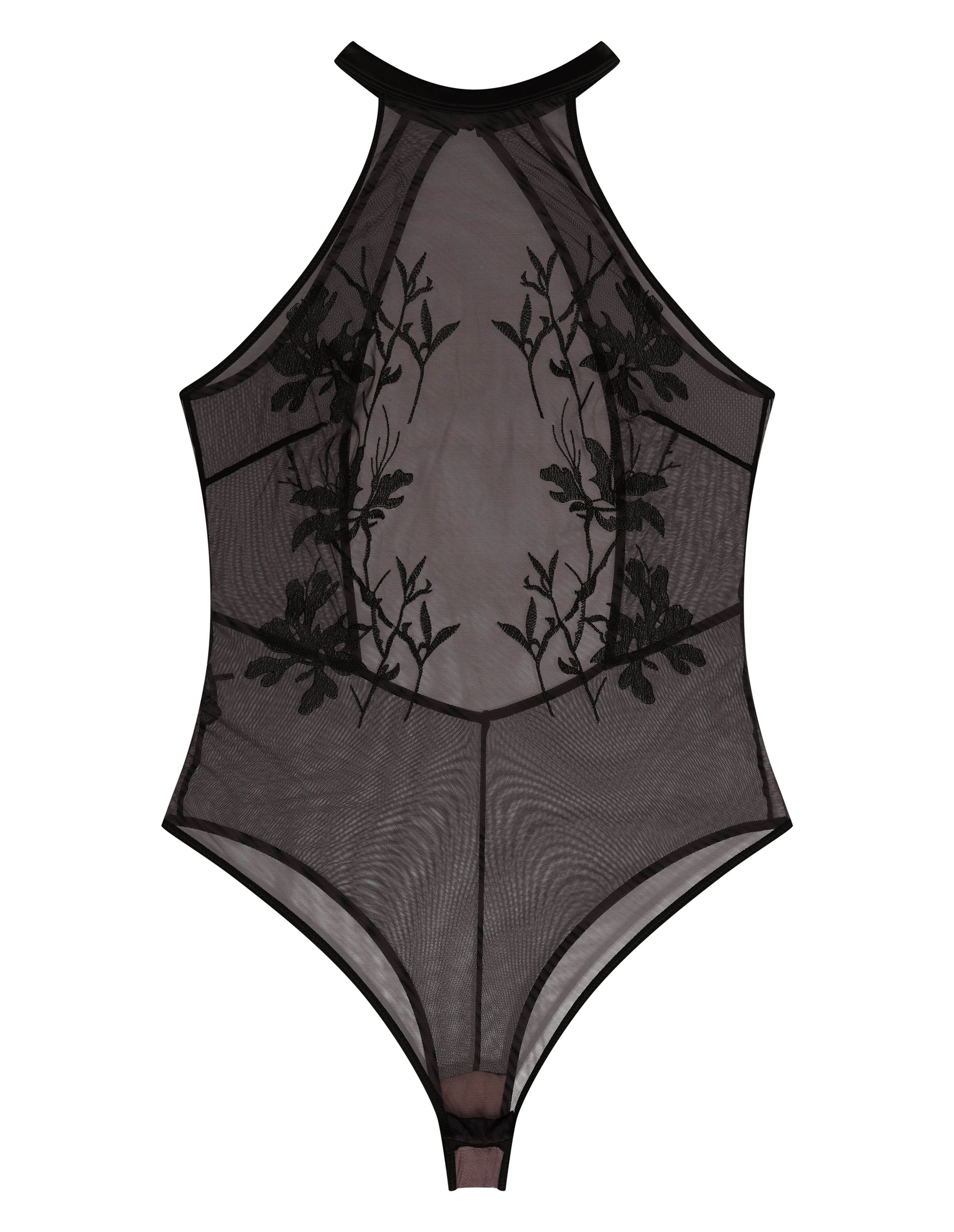 Элегантное боди Barely из полупрозрачной сетки с изысканной вышивкой. Высокий воротник придает загадочности, а изящные детали подчеркивают чувственность силуэта. Идеальный выбор для особых моментов.