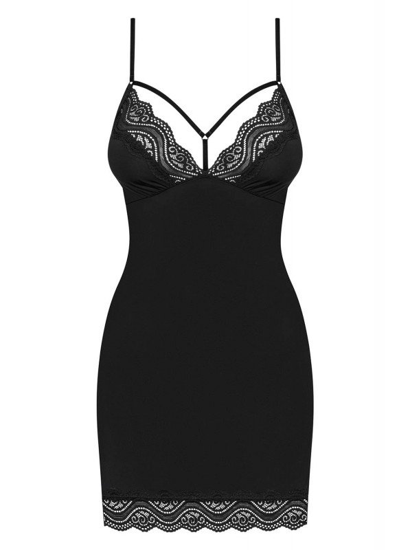 Лаконичная черная сорочка короткой длины, прекрасно подчеркивающая фигуру. Мягкие чашечки сорочки и подол украшены узорчатым кружевом. Тонкие регулируемые бретели красиво соединяются в зоне декольте эластичными тесемками.
