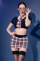 Сексуальный костюм школьницы из 7 предметов для эротических игр. В комплект входят: короткий черный топ с клетчатым галстуком, клетчатая мини-юбка с черным поясом, трусики, чулки и очки.