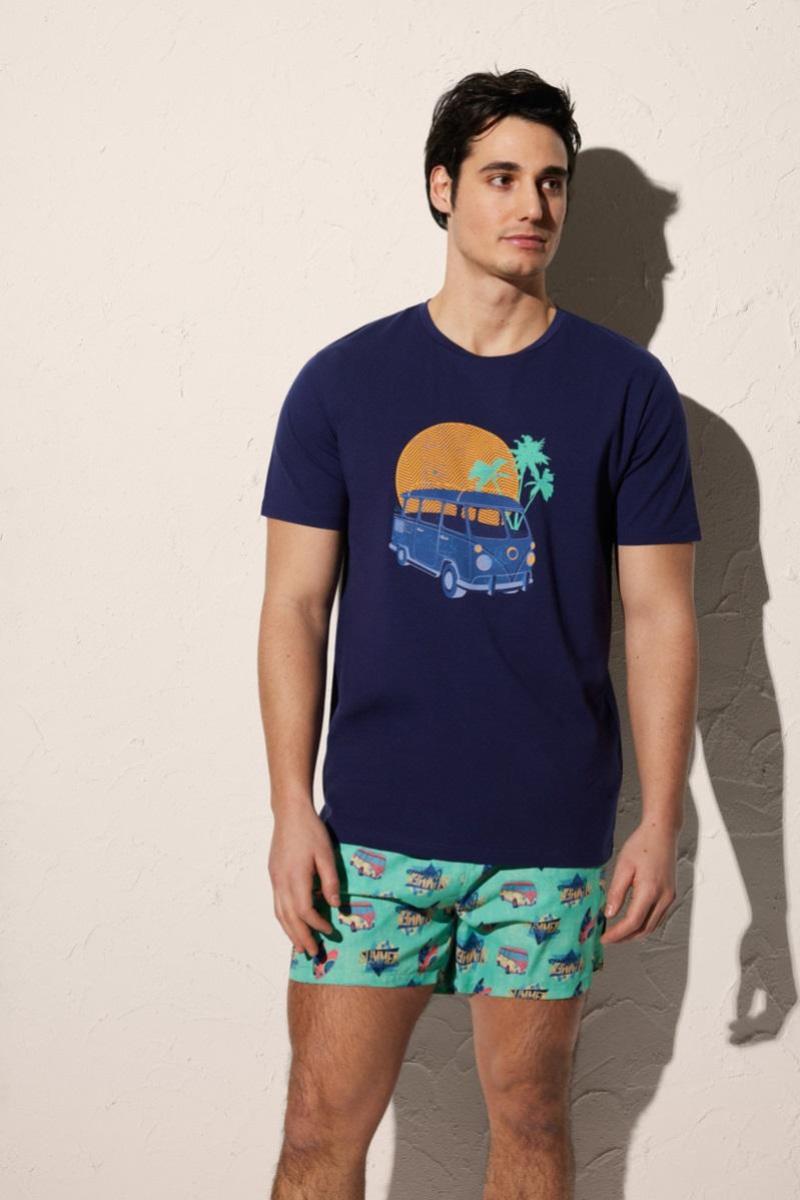 Мужская футболка с принтом автобуса и пальмами. Круглый вырез в области горловины. Изготовлена из натурального хлопка, что делает её мягкой и дышащей для комфортного повседневного использования.