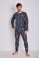 Хлопковая пижама из серии MIKOLAJ. Побалуйте себя и свою семью с FAMILY LOOK от европейского производителя Taro! Кофта и брюки в темно-синем цвете украшены новогодним принтом. Штанины и рукава на изделии заканчиваются манжетами.