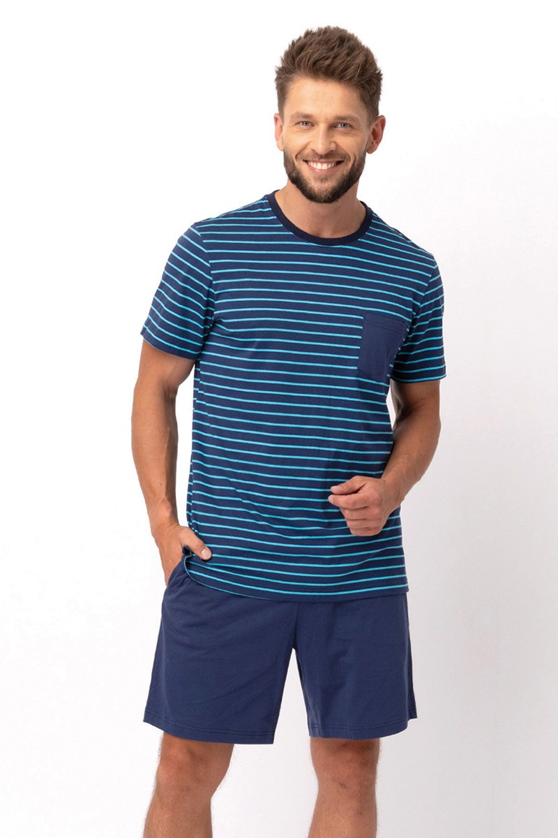Мужская пижама с футболкой и шортами. Комфортная и приятная на ощупь пижама из 100% хлопка. Футболка с коротким рукавом, нагрудным карманом и круглым вырезом горловины. Комфортные шорты свободного кроя с эластичным поясом. Глубокие карманы по бокам.