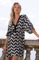 Изысканный V-образный вырез притягивает взгляды и подчеркивает красоту линий, а контрастные черные акценты по краю выреза, рукавам и поясу создают драматичный силуэт, придающий образу особую выразительность. Боковые разрезы добавляют платью игривости и свободы движений, намекая на таинственный дизайн, вдохновленный экзотическими путешествиями и солнечными берегами.