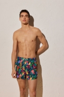Мужские плавки 90097 испанского бренда Ysabel Mora, из коллекции Color dream, темно-синего цвета с контрастным тропическим принтом. Укороченные плавки-шорты, свободного кроя, на эластичном поясе с завязками, имеют два удобных боковых кармана и один карман сзади. Мягкая внутренняя подкладка из микроперфорированной сетки для быстрого отвода воды и влаги. Плавки выполненные из легкой быстросохнущей ткани.