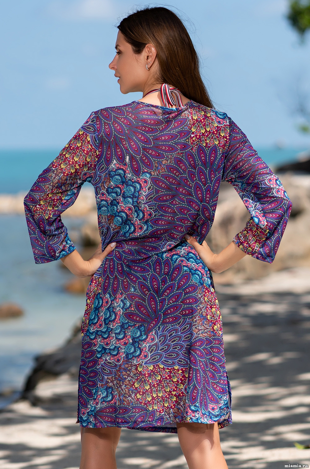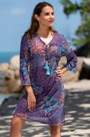Короткая туника Mia-Amore с рукавами 3/4 и полуприлегающим силуэтом выполнена из тонкой гигроскопичной мягкой принтованной сетки. Сетка принтована в виде сложного узор-мультиколор с элементами восточных орнаментов. Вырез горловины оформлен завязками и бусинами.