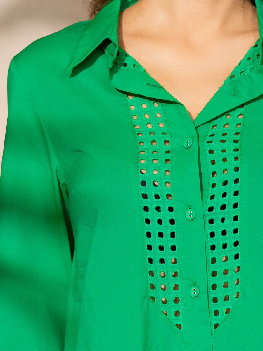 Туника Mia-Amore длиной чуть выше колена, свободного силуэта с центральной застежкой на пуговицы и рукавом длиной 3/4. Изделие выполнено из гладкого хлопка и дополнено декоративными вставками из перфорированного хлопка, которые расположены вдоль бортов. По низу рукавов и низу туники заложены горизонтальные складки.