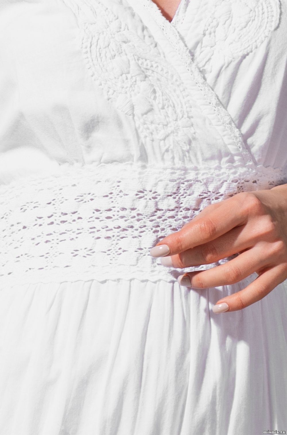 Длинное платье Mia-Amore с рукавами 3/4 из хлопкового полотна. Отрезной лиф платья до талии по фигуре украшен вышивкой. Ярусы нижней части платья декорированы вышивкой. По низу рукавов воланы. Платье на тонкой подкладке из хлопка..