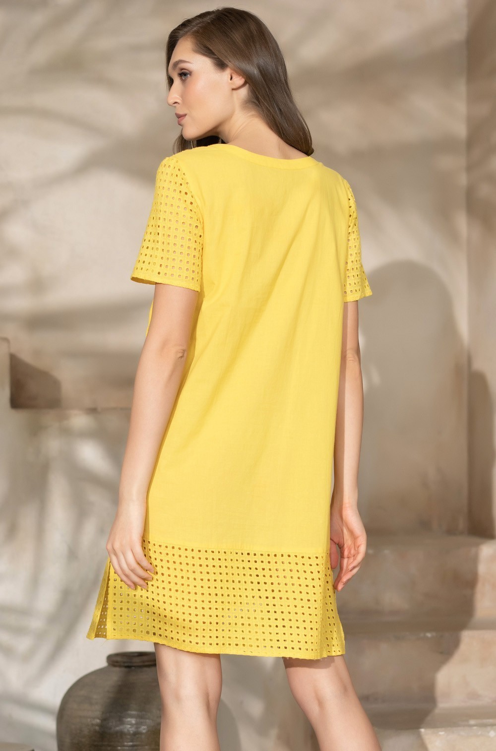 Платье-туника Mia-Amore длиной чуть выше колена, свободного силуэта и коротким рукавом. Изделие выполнено из гладкого хлопка и дополнено декоративными вставками из перфорированного хлопка, которые расположены по рукавам и низу туники.