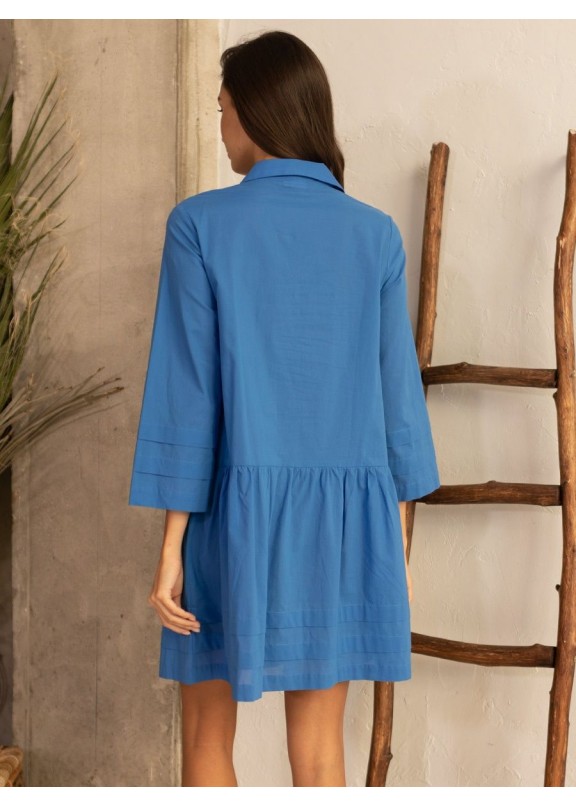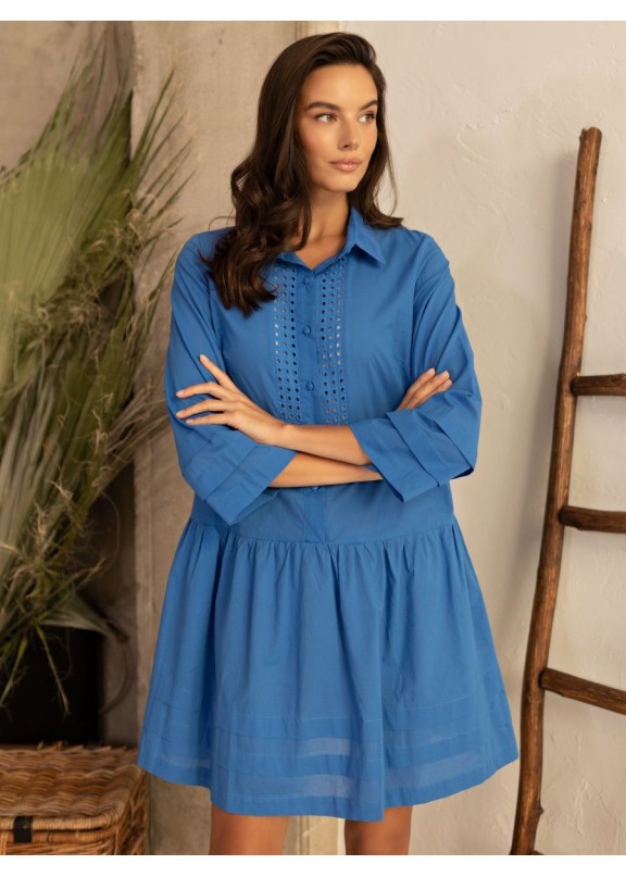 Туника Mia-Amore длиной чуть выше колена, свободного силуэта с центральной застежкой на пуговицы и рукавом длиной 3/4. Изделие выполнено из гладкого хлопка и дополнено декоративными вставками из перфорированного хлопка, которые расположены вдоль бортов. По низу рукавов и низу туники заложены горизонтальные складки.