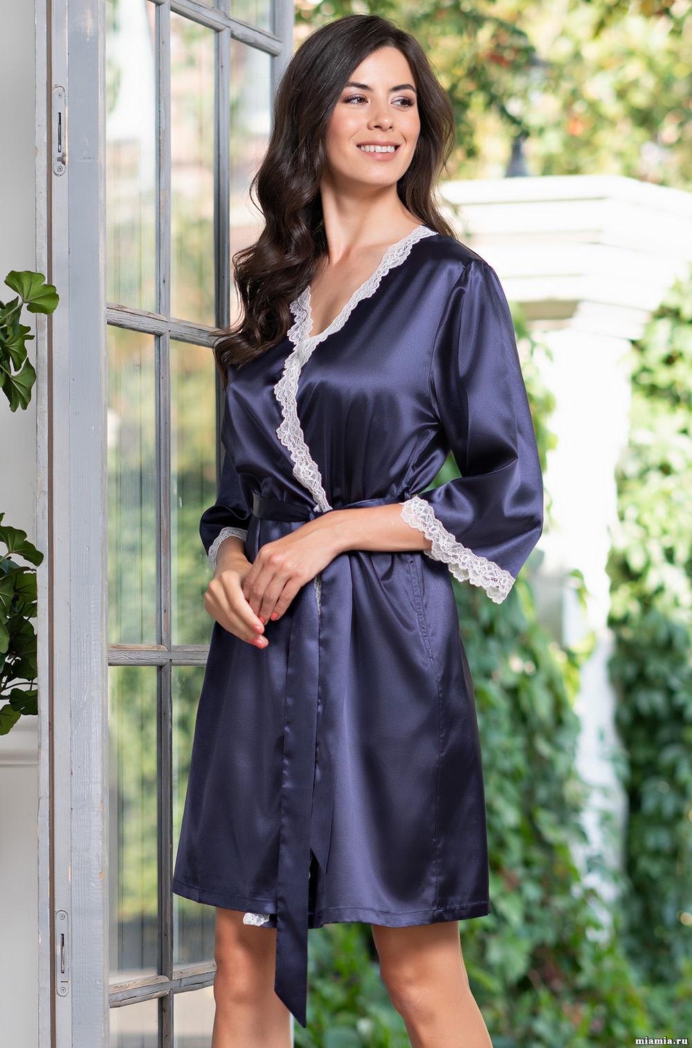 Халат короткий атласный женский домашний Mia-Amore JULIA Джулия 8733 с рукавами 3/4 выполнен из искусственного шелкового полотна с атласным блеском. Рукава и борта халата декорированы изящным кружевом. Халат на запахе с поясом, в боковых швах есть карманы.
