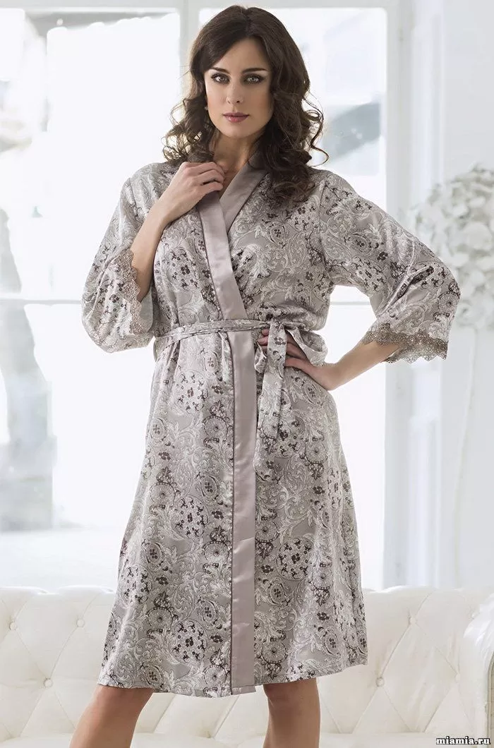 Классический запашной халат-кимоно средней длины Mia-Mella выполнен из принтованного искусственного шелка. В качестве отделки используется ажурное кружево и однотонный атлас.