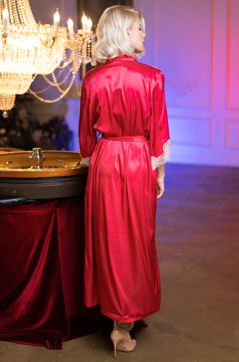 Длинный халат Mia-Amore с широкими рукавами длиной ¾ выполнен из искусственного шелка рубинового цвета. Рукава халата декорированы по низу кружевом. Халат завязывается широким эффектным поясом, в боковых швах карманы.