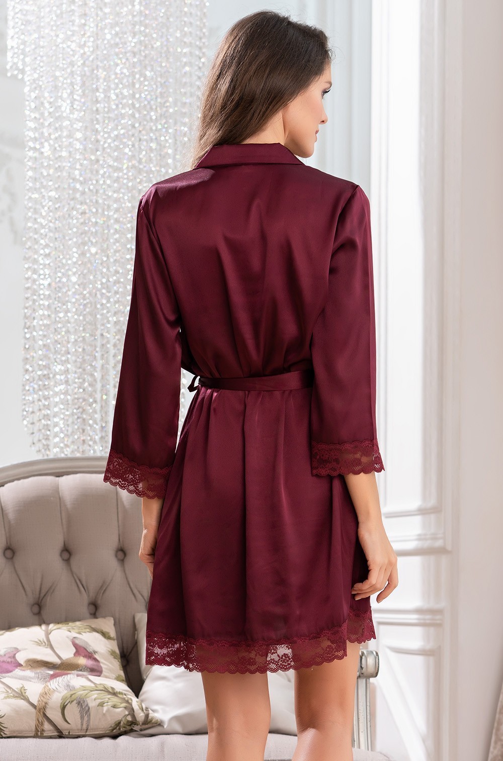 Короткий халат Mia-Amore на пуговицах с рукавом длиной 3/4, выполнен из однотонного искусственного шелка с блеском. Кружевные вставки украшают низ рукавов, низ изделия и концы пояса. В боковых швах обработаны карманы.