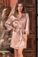 Короткий халат Mia-Amore на пуговицах с рукавом длиной 3/4, выполнен из однотонного искусственного шелка с блеском. Кружевные вставки украшают низ рукавов, низ изделия и концы пояса. В боковых швах обработаны карманы.