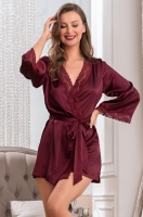 Короткий халат Mia-Amore на пуговицах с рукавом длиной 3/4, выполнен из однотонного искусственного шелка с блеском. Кружевные вставки украшают низ рукавов, низ изделия и концы пояса. В боковых швах обработаны карманы.