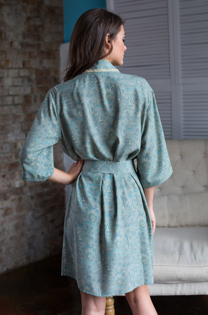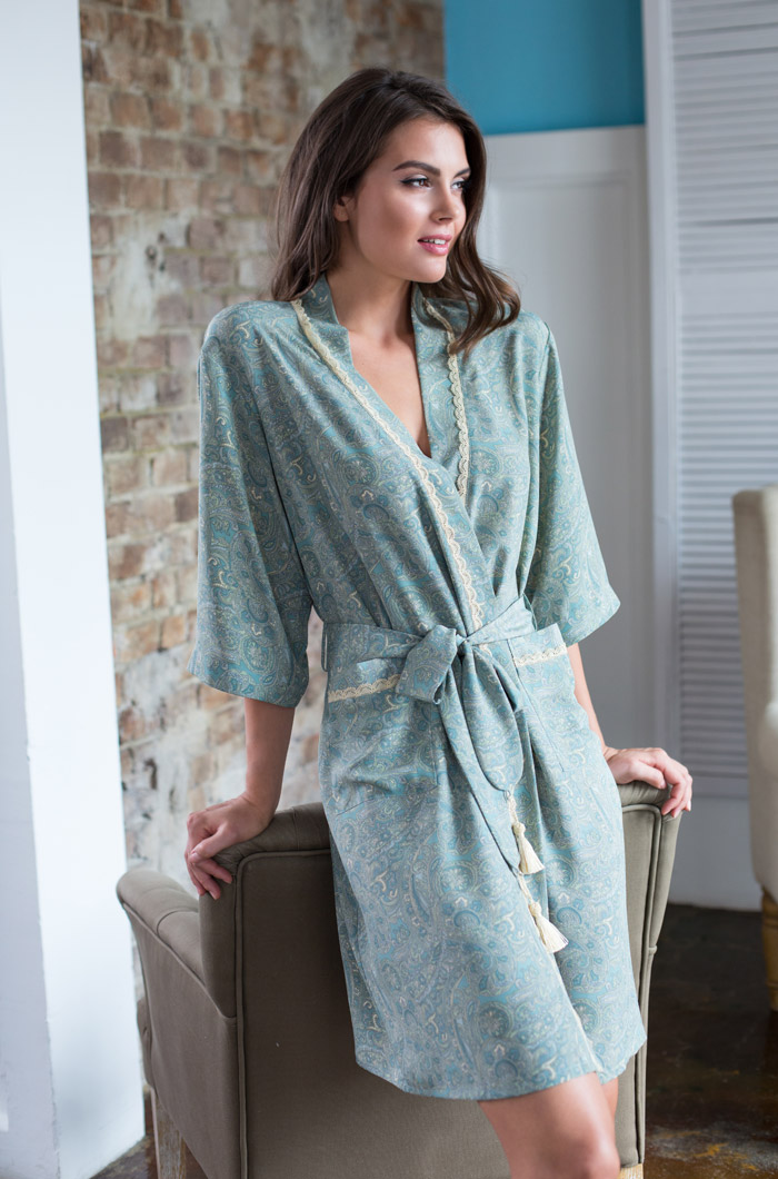 Халат Миа-Миа средней длины (до колен) прямого силуэта из принтованного крепа. Втачной рукав 3/4, борт и накладные карманы декорированы тонким кружевом. Халат завязывается на пояс с помпонами.