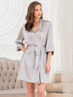 Короткий халат женский домашний Mia-Amore ДЖУЛИЯ с рукавами три четверти выполнен из искусственного шелкового полотна с атласным блеском. Рукава и борта халата декорированы изящным кружевом. Халат на запахе с поясом, в боковых швах есть карманы.