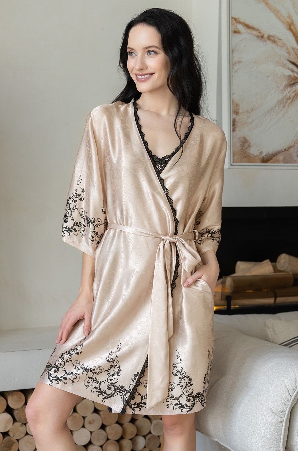 Халат-кимоно Mia-Amore из принтованного в виде купона искусственного атласа на жаккардовой основе. Рукава длиной до локтя. Узкое кружево расположено вдоль бортов. Карманы в боковых швах.