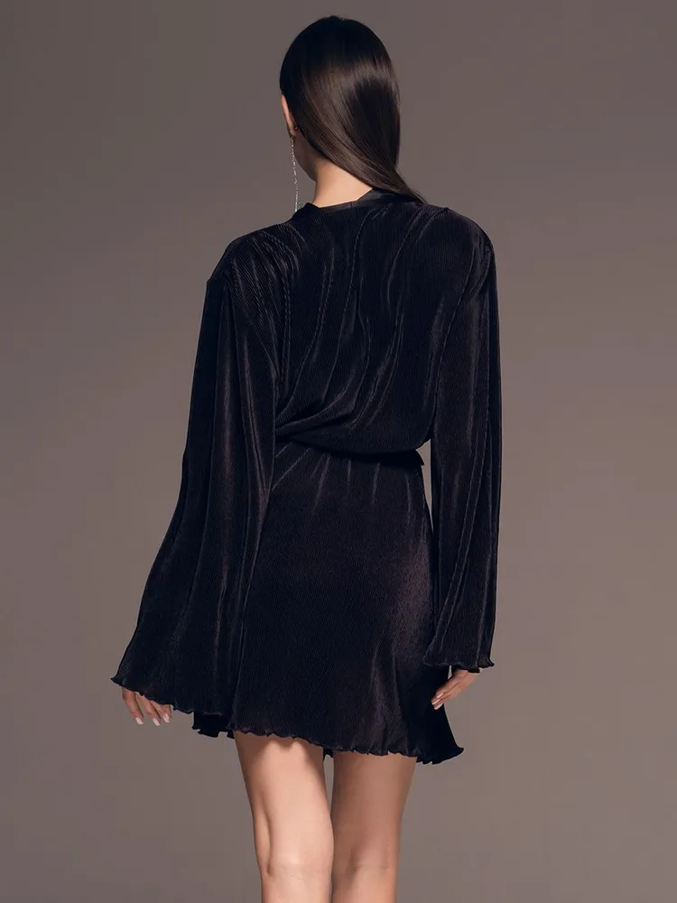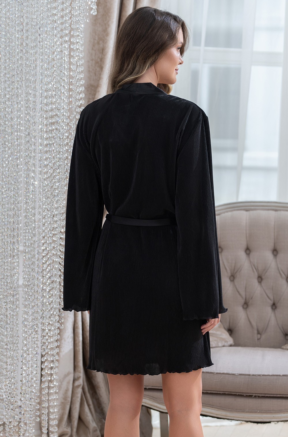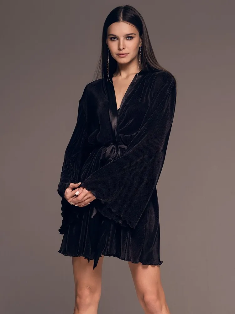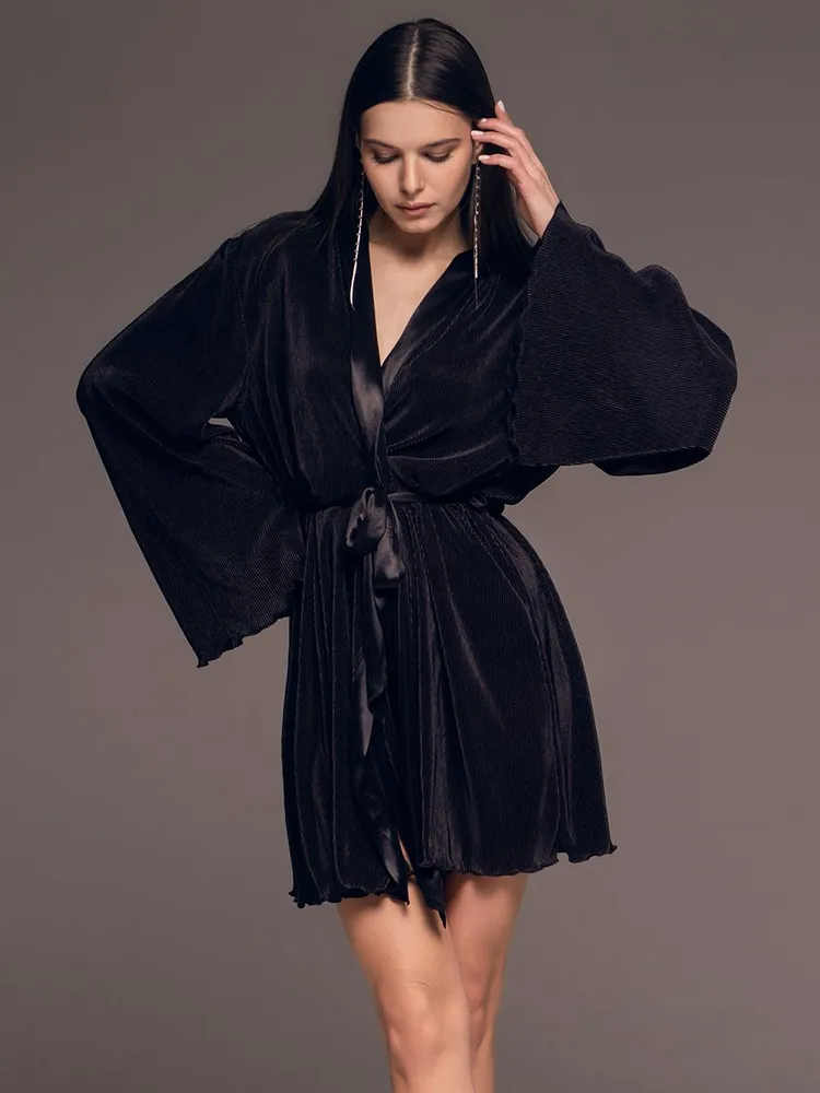 Элегантный халат чёрный плиссе с широким рукавом Рокси 7373 Mia-Amore имеется в размерах: S/M. L/XL. 2XL/3XL.