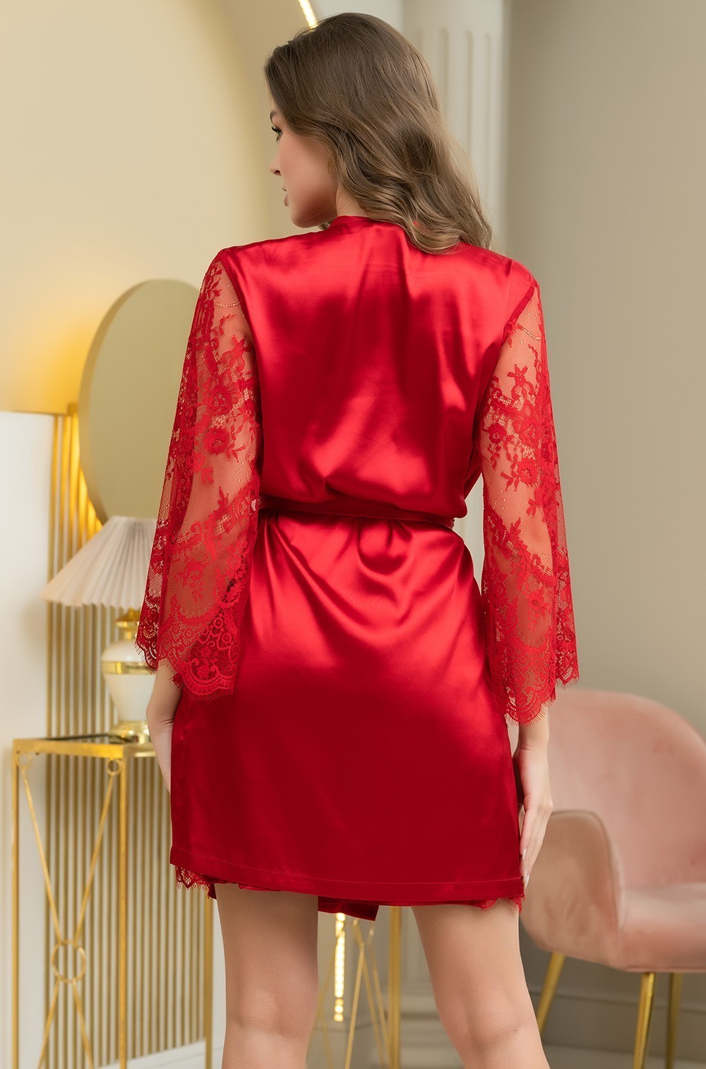 Халат красный сексуальный ESTER 7293 - это короткое запашное изделие от Mia-Amore, выполненное из атласа и украшенное широкими кружевными рукавами длиной ниже запястья. Халат застегивается на запах, а в боковых швах имеются карманы для удобства. Талия акцентируется благодаря широкому поясу.