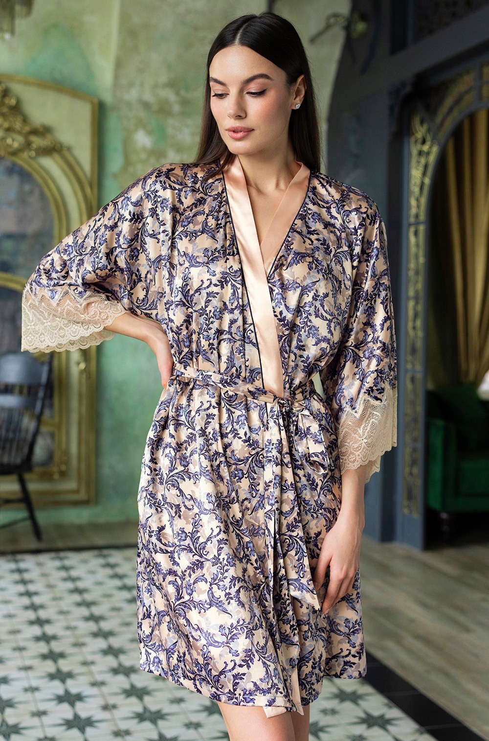 Carol 7383 от Mia-Amore — это стильный и удобный короткий запашной халат-кимоно, который станет отличным дополнением к вашему домашнему гардеробу. Этот халат выполнен из искусственного принтованного шелка, что придает ему легкость и изысканность. Однотонная и кружевная отделка добавляют утонченности и женственности. Контрастный кант подчеркивает линию борта, делая халат еще более элегантным. Широкие рукава длиной 3/4 и карманы в боковых швах делают халат удобным и функциональным. Вы сможете наслаждаться комфортом и стилем одновременно.