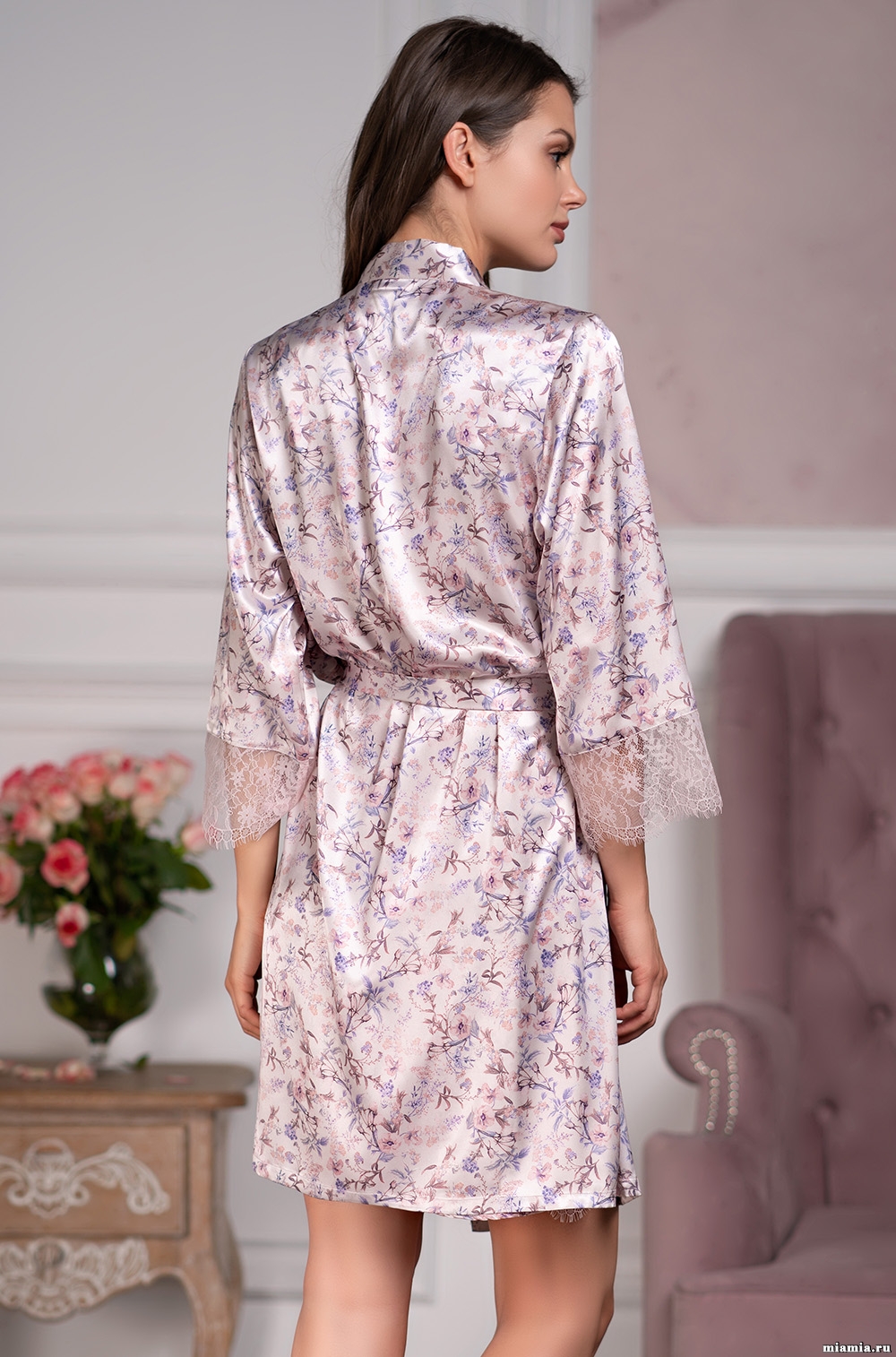 Короткий халат Mia-Amore с рукавами длиной ¾ выполнен из принтованного искусственного шелка. По низу рукавов халата декорированы широким кружевом, по борту проходит атласный декоративный кант.