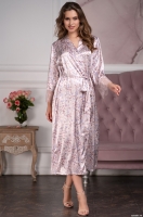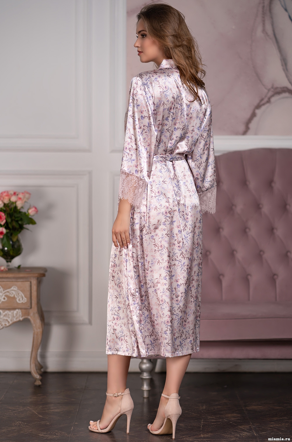 Длинный халат Mia-Amore с рукавами длиной ¾ выполнен из принтованного смесового шелка. По низу рукавов халата декорированы широким кружевом, по борту проходит атласный декоративный кант.