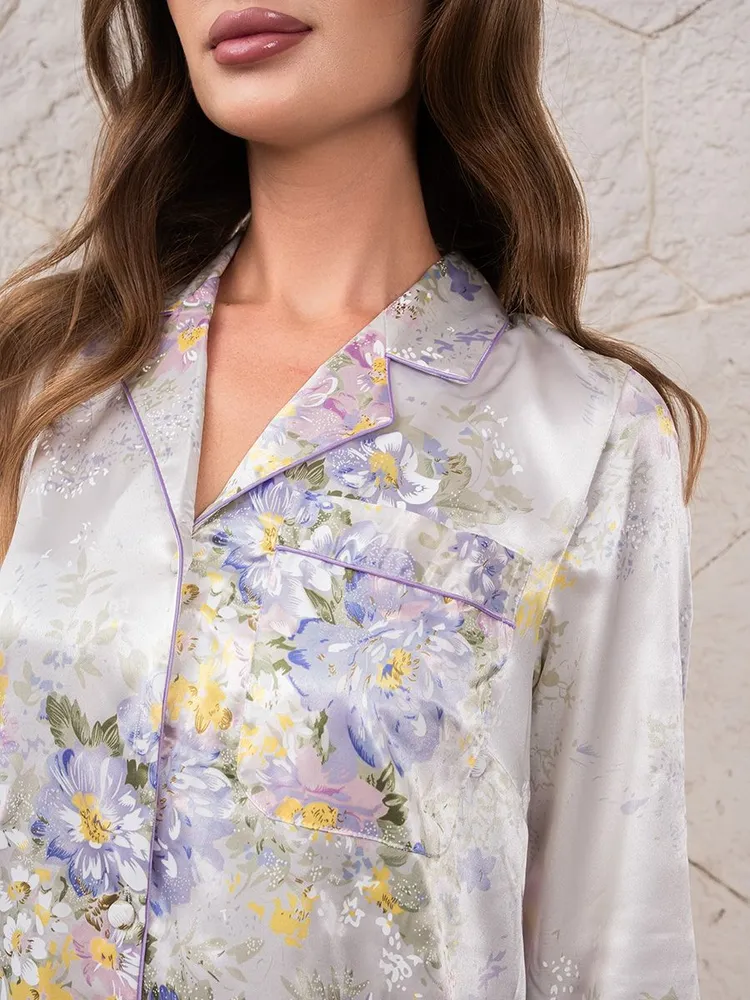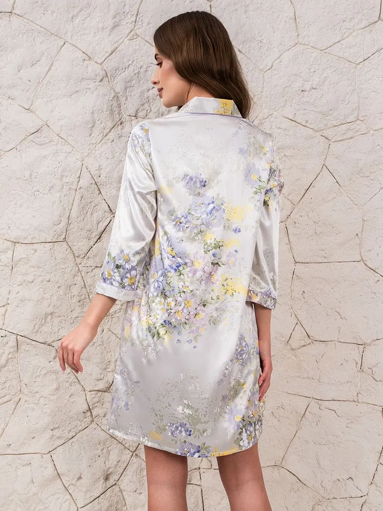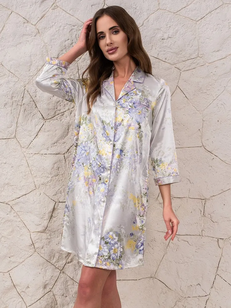 Рубашка Mia-Amore с центральной застежкой на пуговицы на пуговицах с рукавами длиной 3/4, выполнена из смесового принтованного шелка. Низ рукавов, борт и воротник обработаны атласными кантами. В боковых швах расположены карманы. Шёлковое бельё прекрасный подарок на 8 Марта, День рождения, День всех Влюбленных!
