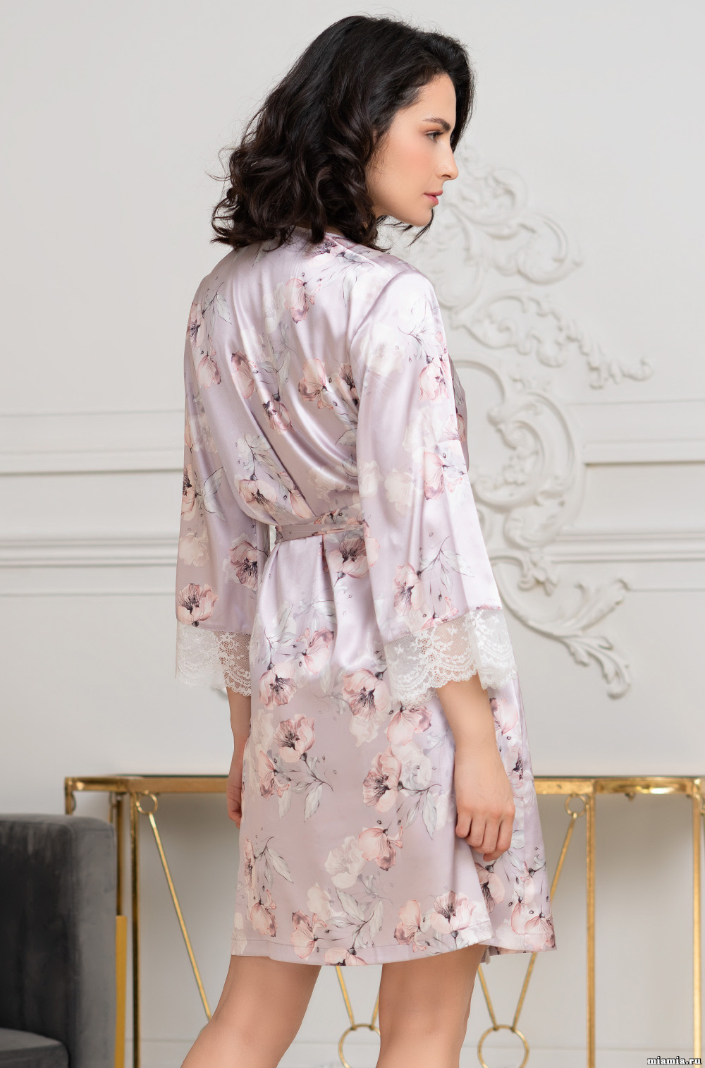 Короткий запашной халат Mia-Amore с широким длинным рукавом, выполнен из принтованного смесового шелка и декорирован ажурным кружевом, которое расположено по низу рукавов и вдоль бортов полочек. По бокам обработаны карманы.