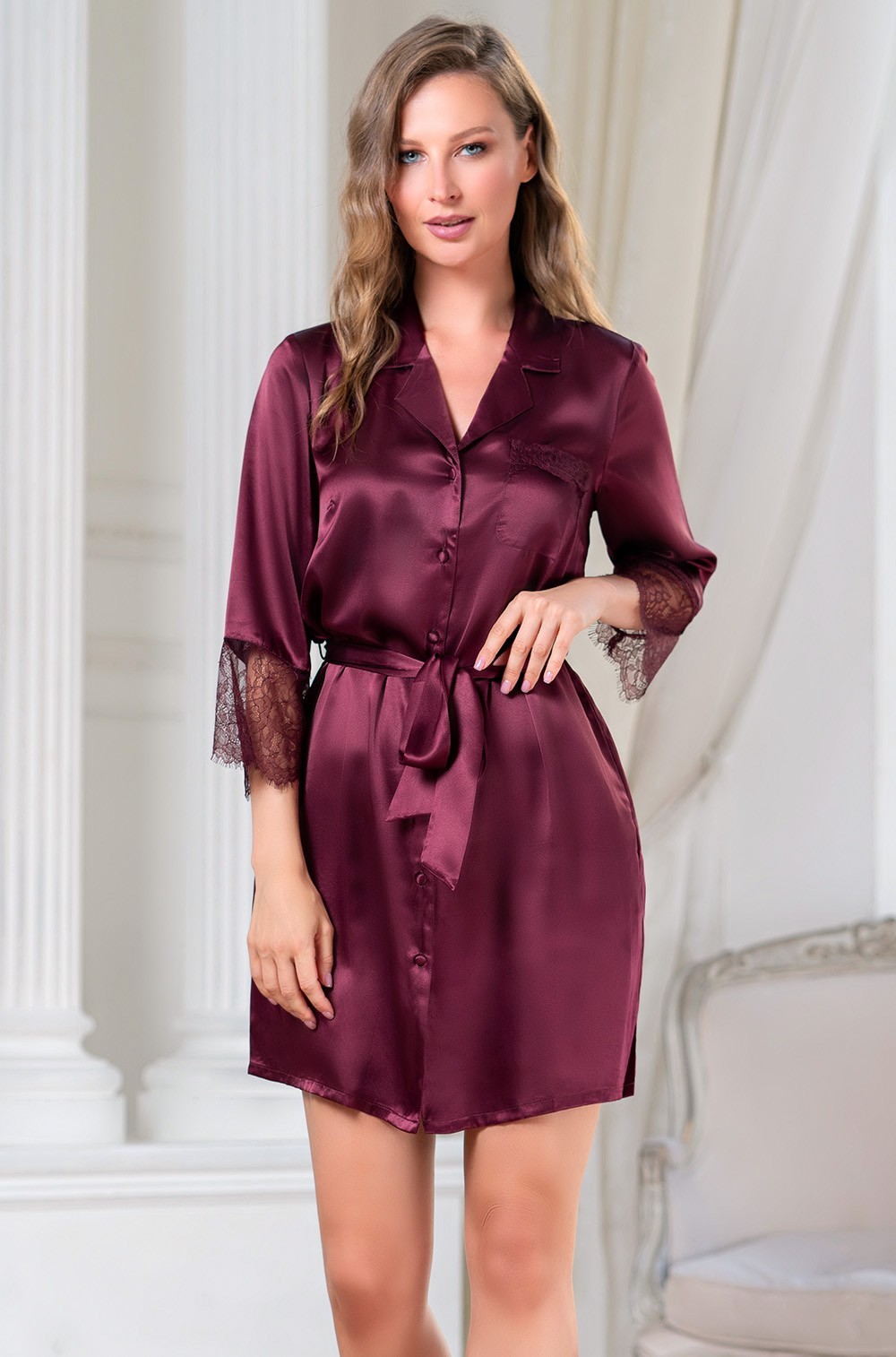 Шёлковый халат женский рубашечного типа SHARON Шерон 3807 бордо Mia-Amore имеется в размерах XS.S. M. L. XL. -