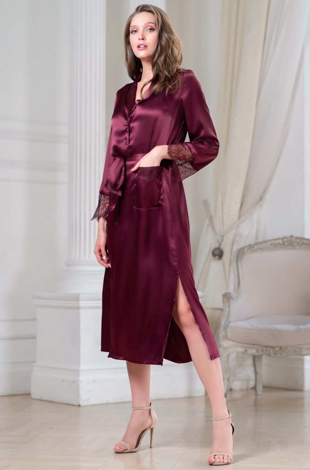 Тип Халат длинный Цвет Бордо Модель Халат с рукавом 3/4 Материал Смесовый шёлк