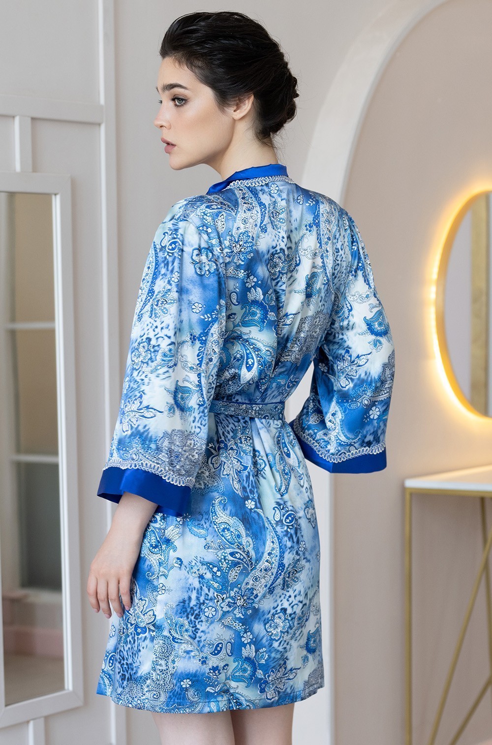 Тип Халат короткий Цвет Синий Модель Халат с рукавом 3/4 Материал Смесовый шёлк