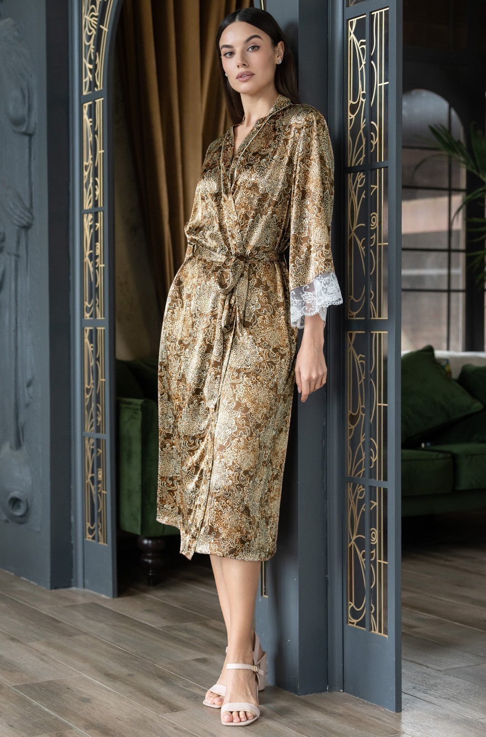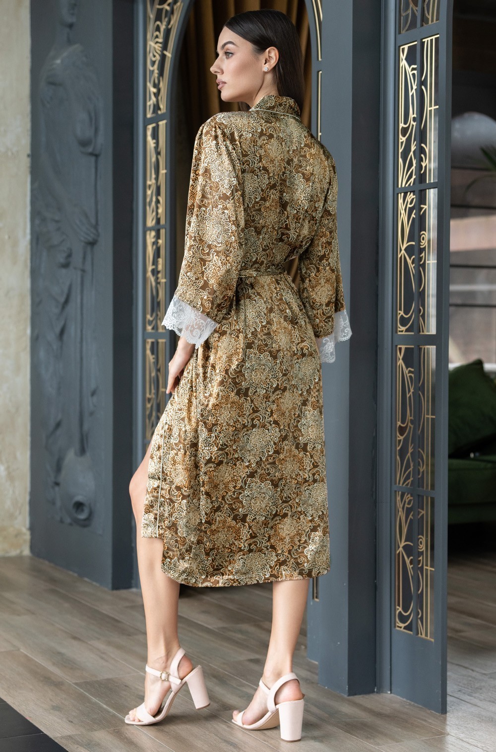 Тип Халат длинный Цвет Капучино Модель Халат с рукавом 3/4 Материал Смесовый шёлк
