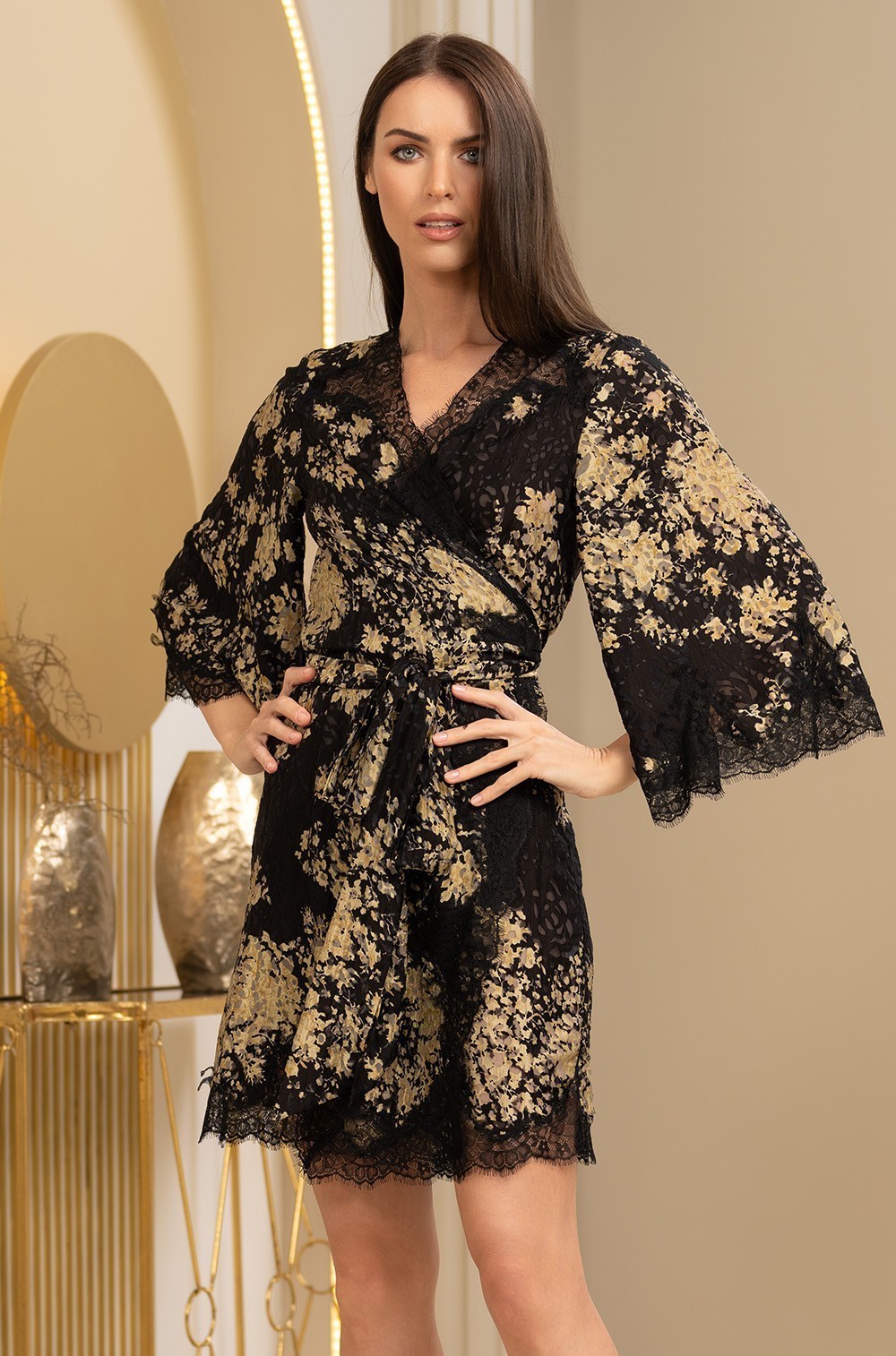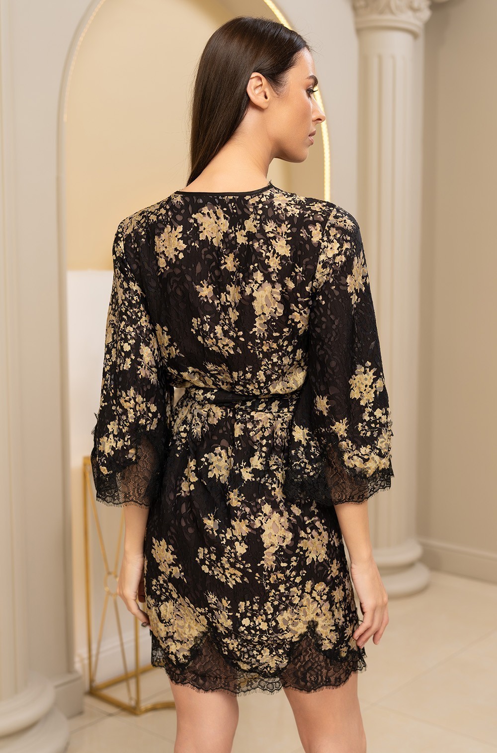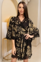 -Борт, низ халата и низ широких рукавов украшены ажурным чёрным кружевом: Придает халату изысканность и соблазнительность.