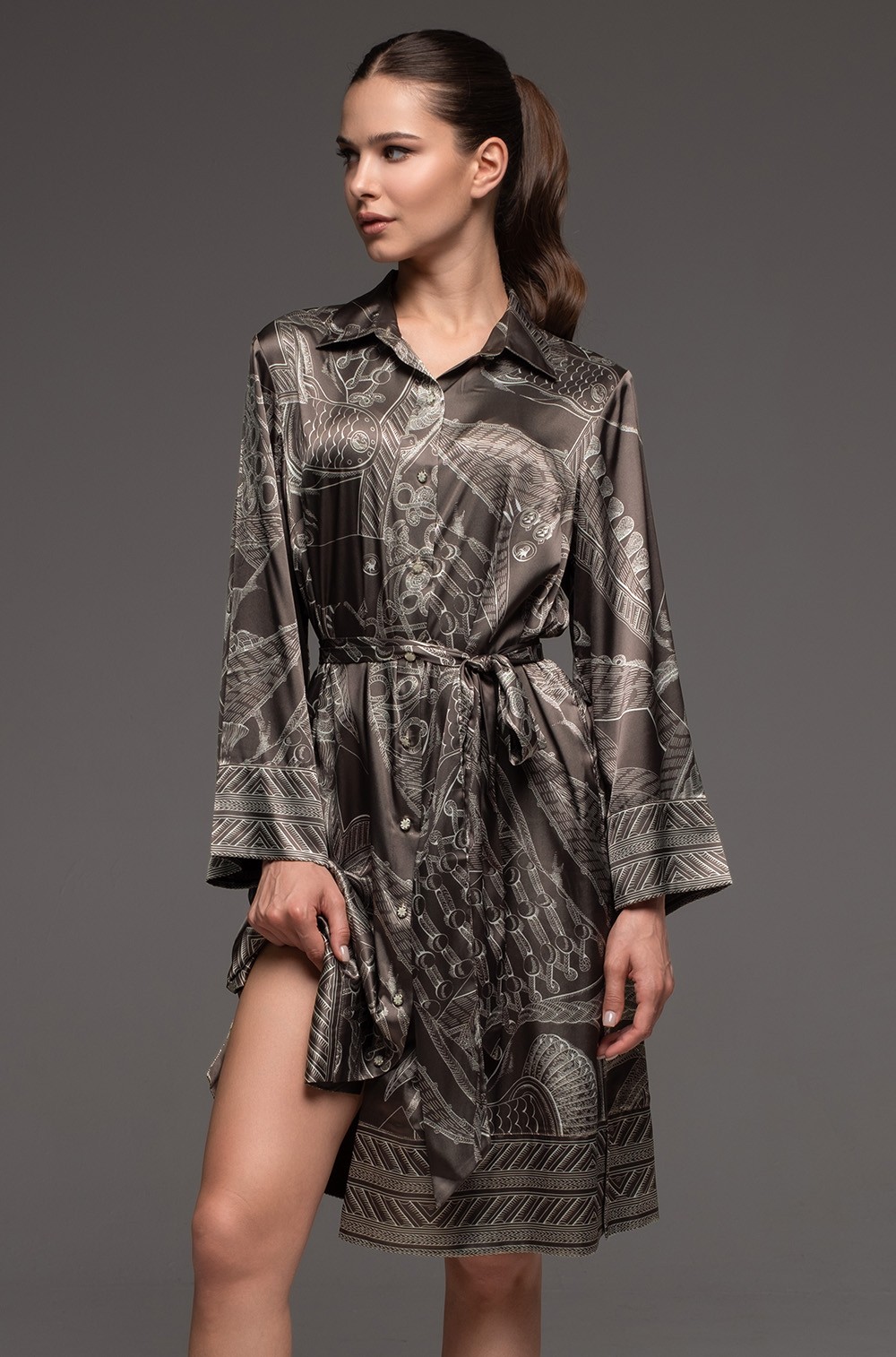 Aisha 4327. Рубашка Mia-Amore свободного силуэта с длинным рукавом — это идеальное сочетание комфорта и стиля. Изделие выполнено из принтованного смесового шелка, что придает ему особый шарм и изысканность. В боковых швах обработаны карманы, а по бокам расположены разрезы для свободы движения. Линию талии можно подчеркнуть за счет широкого пояса, который идет в комплекте.