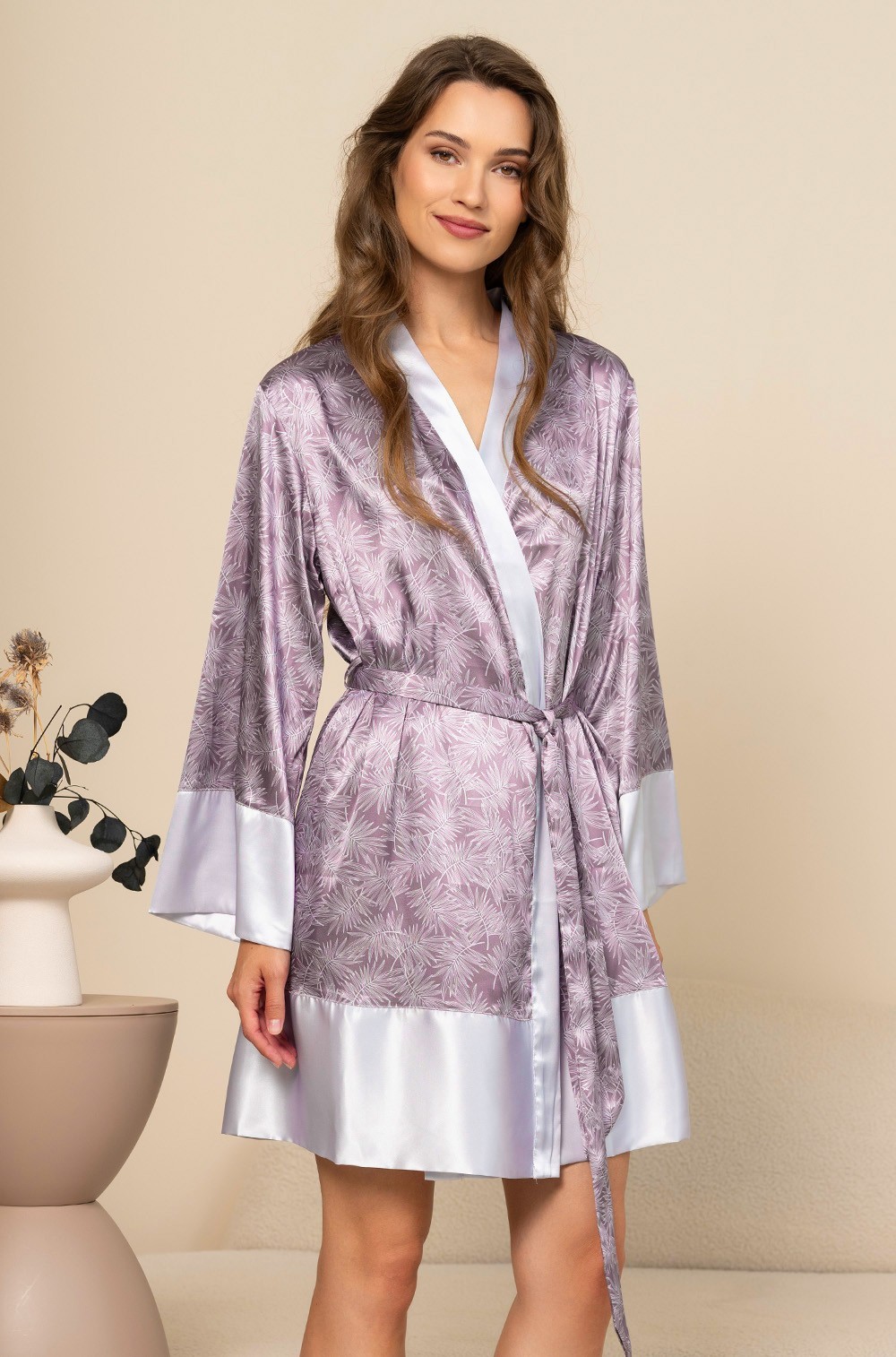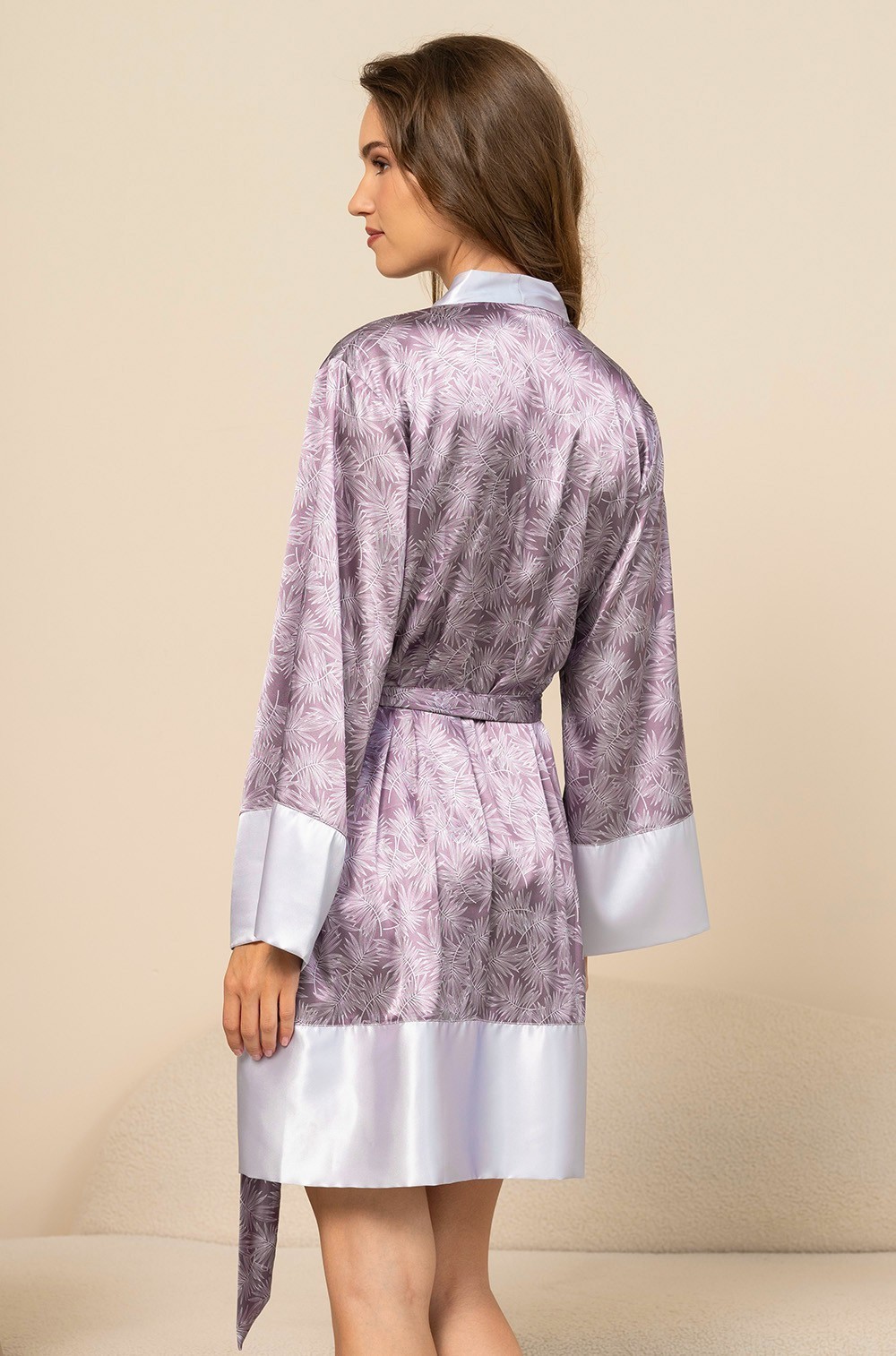 Короткий запашной халат Mia-Amore — это идеальное сочетание утончённой элегантности и непревзойдённого комфорта. Выполненный из принтованного смесового шёлка, он привлекает внимание своим изысканным дизайном и благородным серым цветом, который украшает низ изделия и рукава, придавая ему особый шарм.