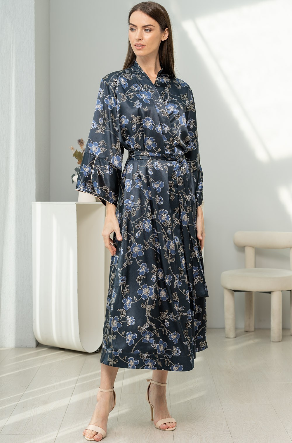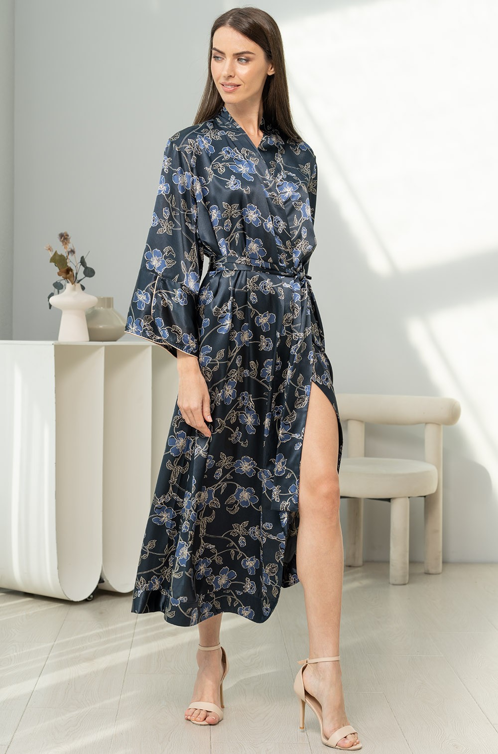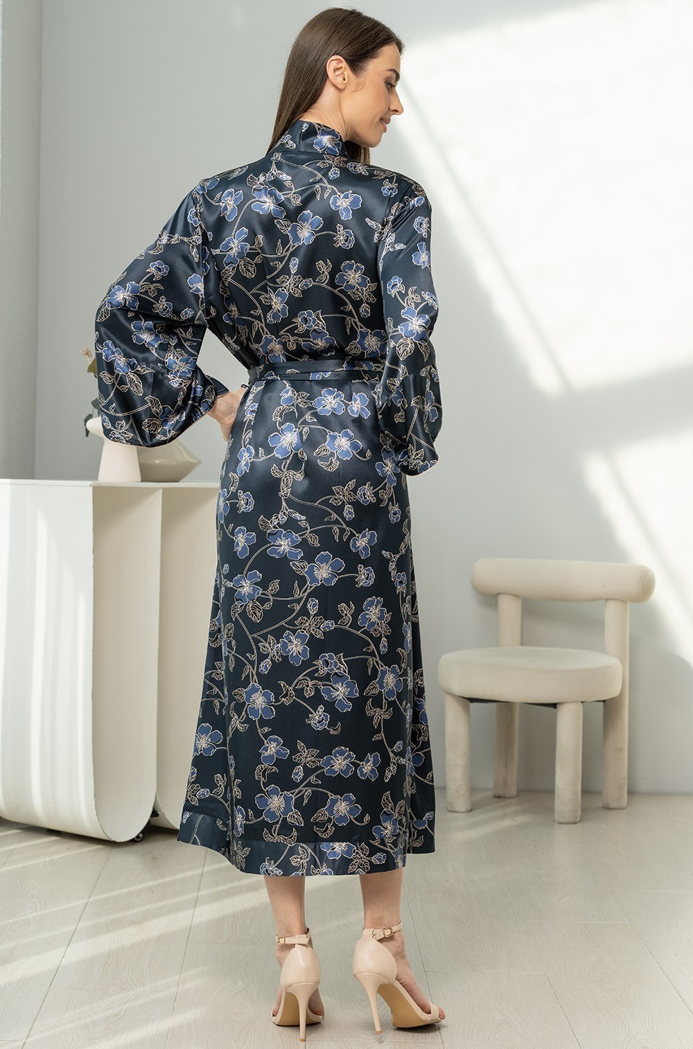 Тип Халат длинный Цвет Синий Модель Халат с длинным рукавом Материал Смесовый шёлк