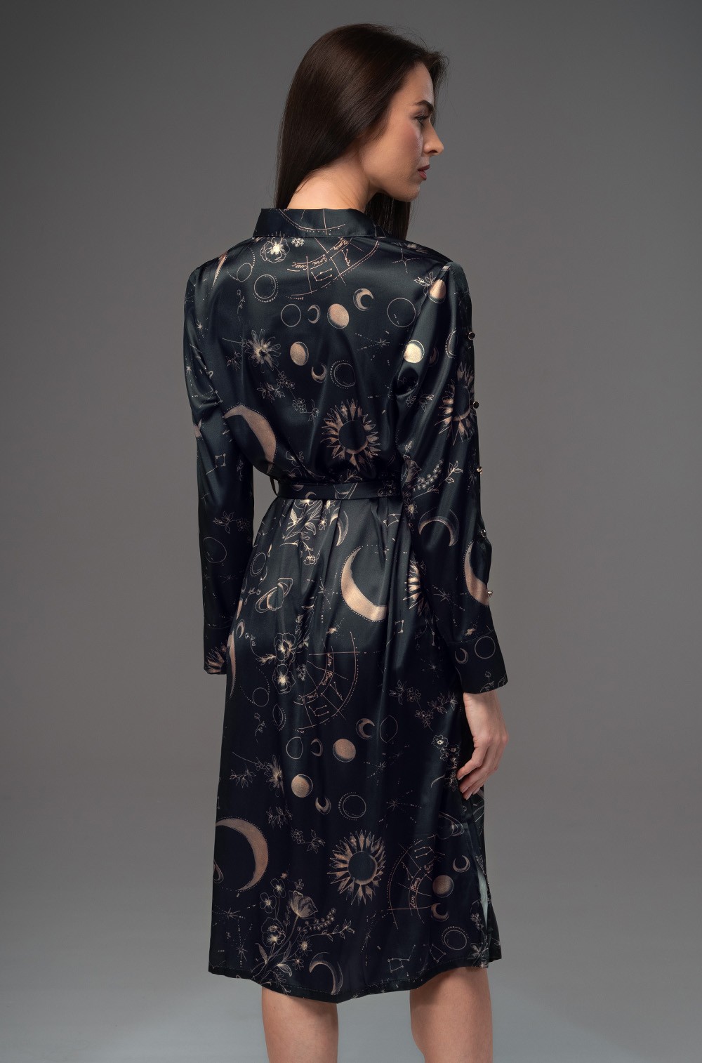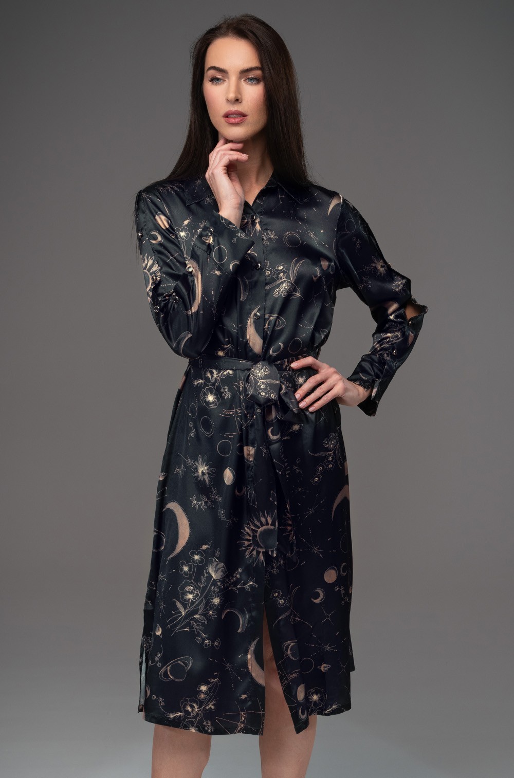Galateya 4467. Удлиненная рубашка Mia-Amore с длинными рукавами и центральной застежкой на золотистые пуговицы — это воплощение изысканности и стиля. Выполненная из принтованного смесового шёлка, она сочетает в себе комфорт и роскошь, что делает её идеальным выбором как для повседневного, так и для более формального образа. Рукава рубашки украшены необычной декоративной застежкой вдоль всей длины, что придает изделию уникальность и особый шарм. В боковых швах предусмотрены удобные карманы, куда можно положить мелкие предметы, не теряя удобства и практичности. Особенностью этой рубашки является съёмный пояс, который позволяет регулировать силуэт и подчеркнуть талию, создавая женственный и утончённый образ.