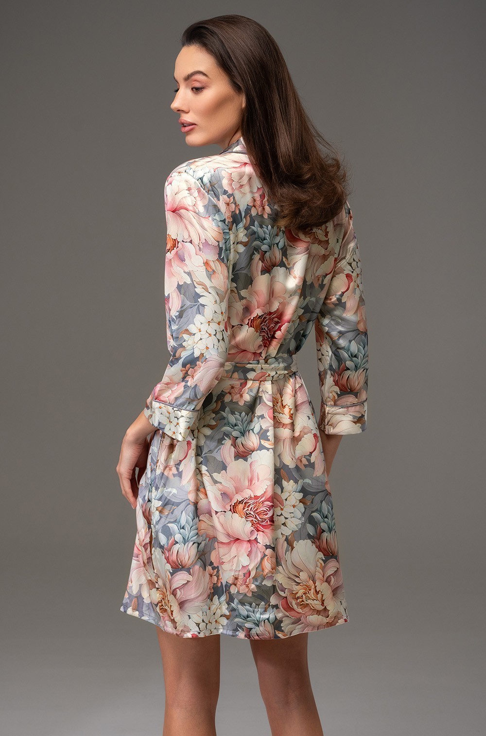 • Florin 4484. Короткий халат Mia-Amore из коллекции Florin сочетает в себе стиль и удобство. Этот халат оснащен застежкой на пуговицы и рукавом длиной 7/8, выполнен из принтованного смесового шелка. Борт, воротник и манжеты рубашки украшены контрастным тонким кантом, что придает изделию изысканный вид. В боковых швах расположены удобные карманы, а в комплекте идет пояс, позволяющий подчеркнуть линию талии и создать элегантный силуэт.