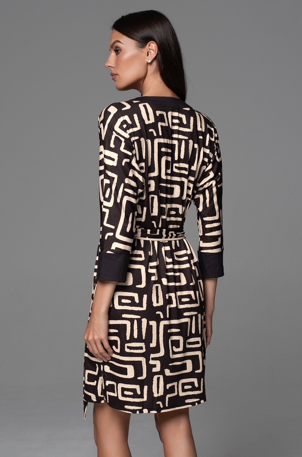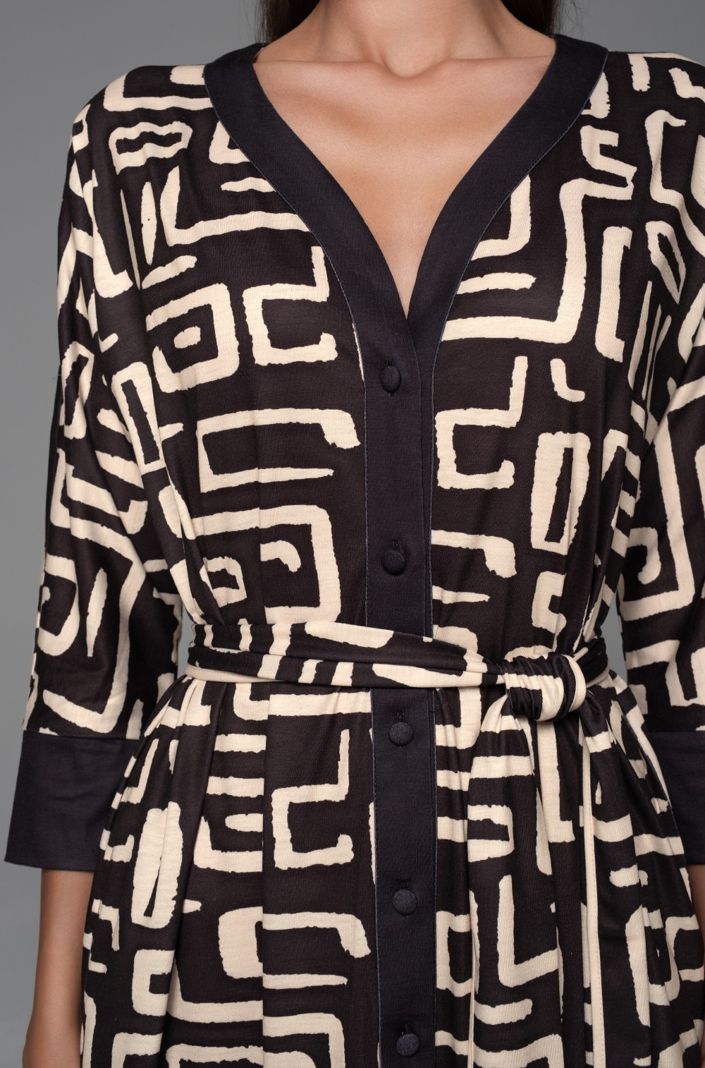 -принтованное трикотажное полотно с однотонной отделкой — выразительное сочетание, которое делает халат стильным акцентом в домашней обстановке;