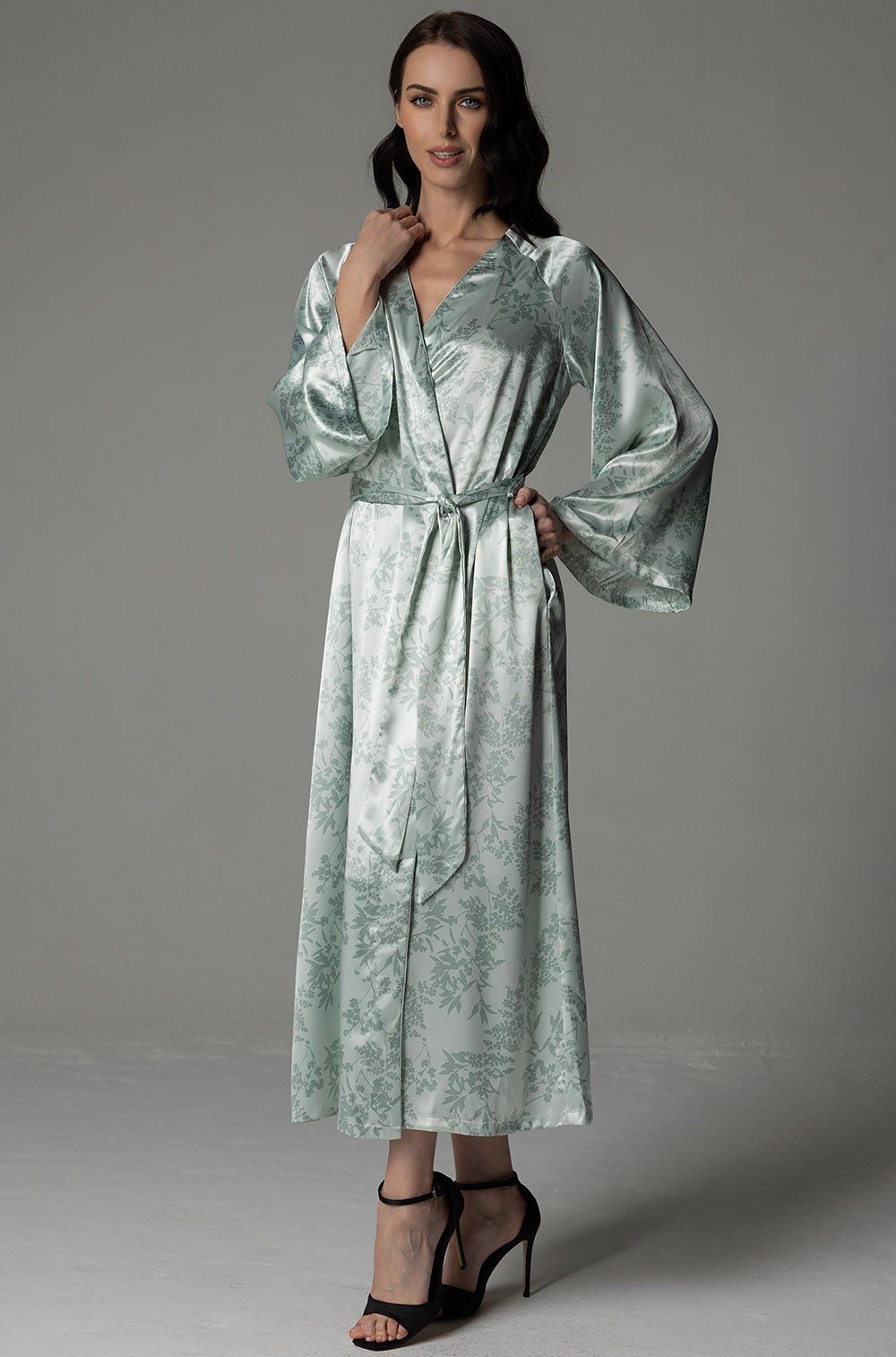 Длинный элегантный запашной халат с широким длинным рукавом — воплощение роскоши и комфорта для особенных моментов. Модель выполнена из принтованного смесового шёлка, который сочетает благородство натурального материала с практичностью современных волокон.