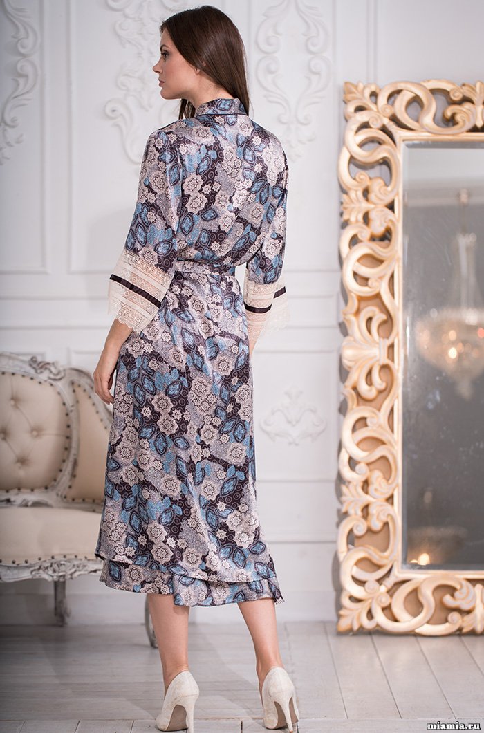 Длинный запашной халат Mia-Amore на поясе с рукавами 7/8. Низ рукава и пояс декорированы нежным ажурным кружевом, а атласная тесьма цвета горького шоколада придает модели изысканность.