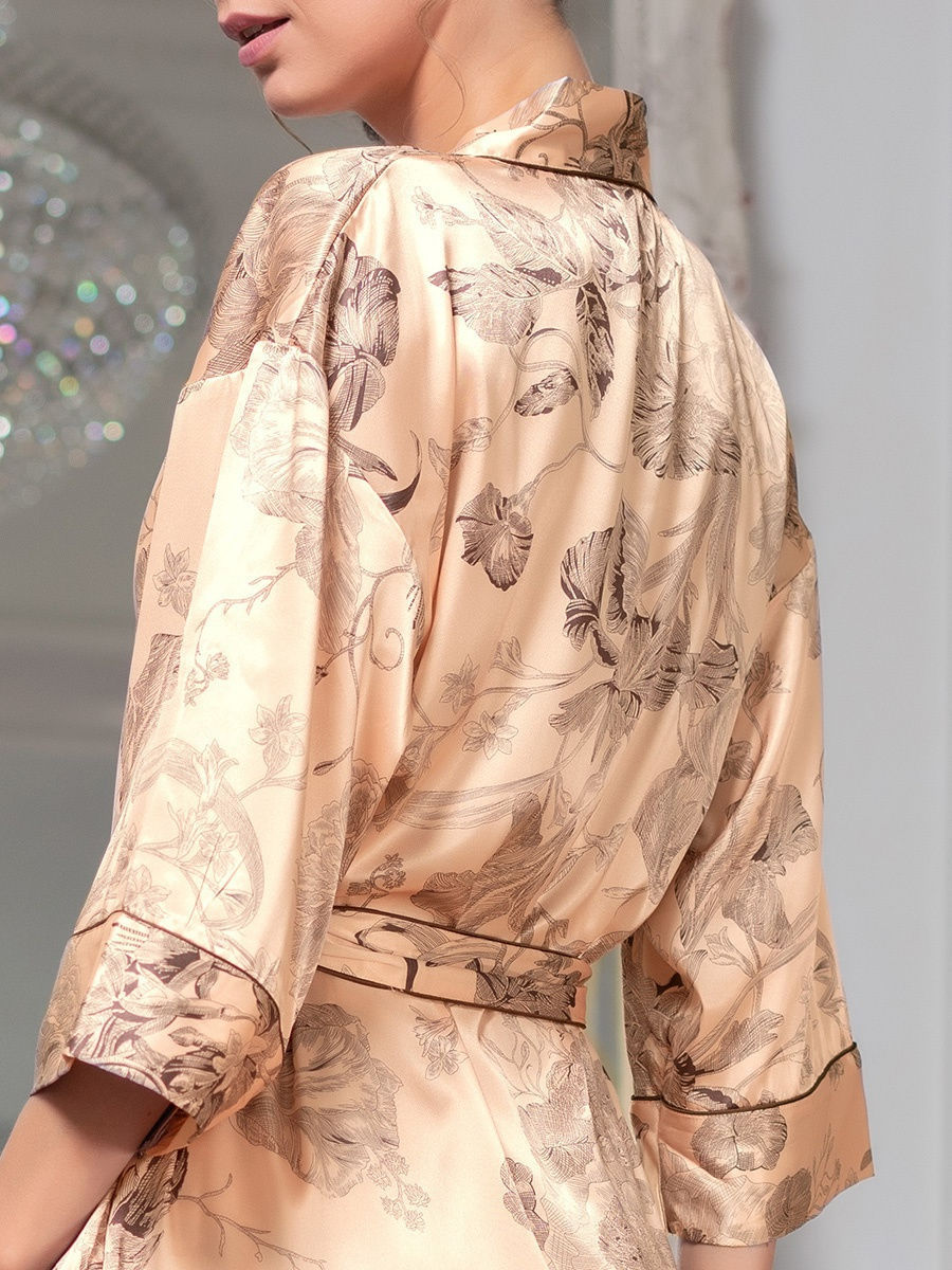 Короткий халат – кимоно Mia-Amore из смесового шелкового полотна молочного цвета с цветочным орнаментом. Борта халата, притачные широкие манжеты на рукавах ¾ и широкий пояс халата, декорированы тонким кантом цвета графит, в тон принта.