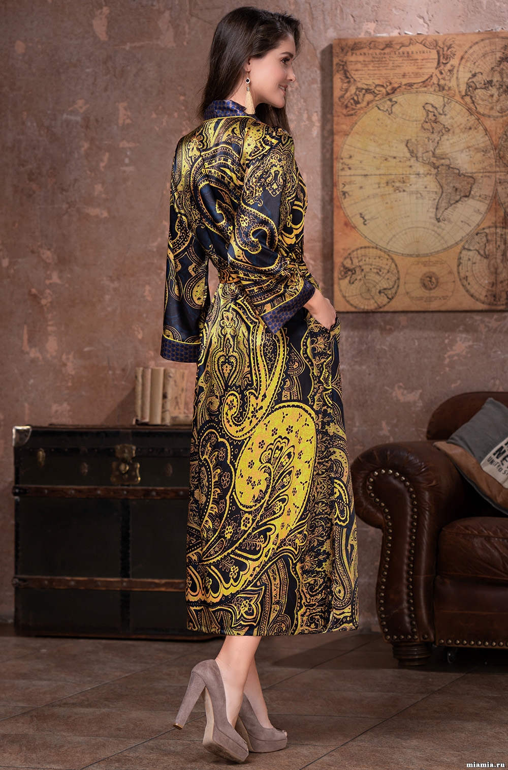 Длинный халат – кимоно Mia-Amore из смесового шелкового полотна с роскошным восточным узором. Борта халата и притачные манжеты на длинных рукавах выполнены из ткани-компаньона с кантом золотистого оттенка, в цвет рисунка. В боковых швах карманы. В комплекте идет пояс. Длинный халат выполненный из смесового шелка всегда смотрится роскошно. Рукава халата заканчиваются широким манжетами или кружевом.