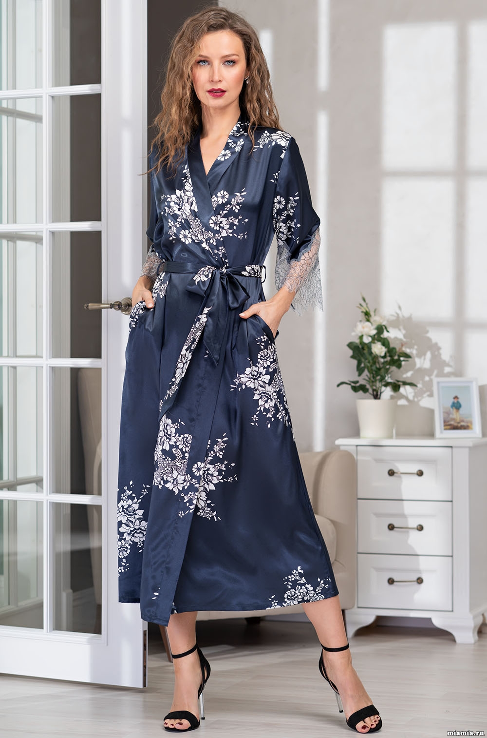 Шёлковый халат длинный запашной с кружевом 3579 Александрия Mia-Amore имеется в размерах: S/M. L/XL. 2XL/3XL